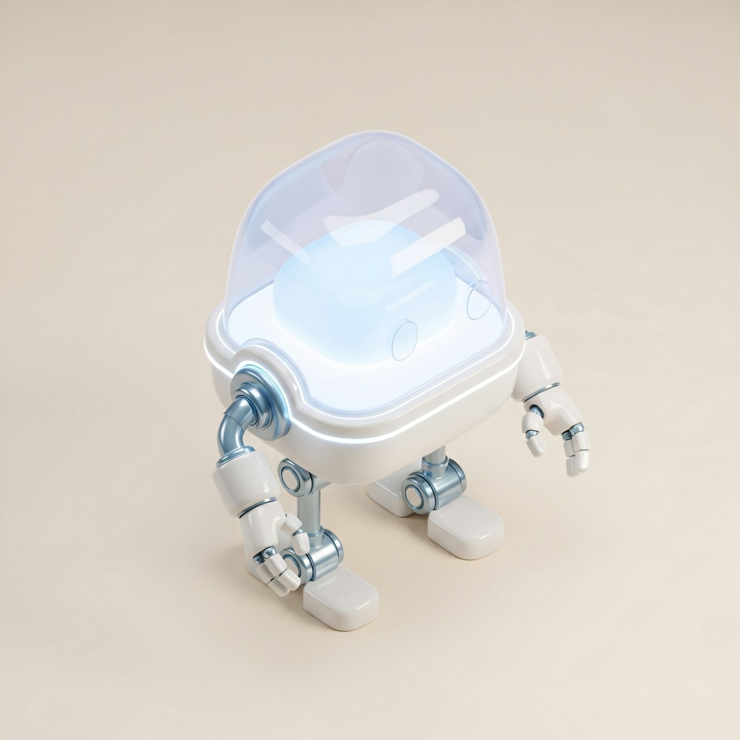 A sleek, futuristic robot with a glowing dome head and articulated limbs, set against a neutral background for a clean, modern look.