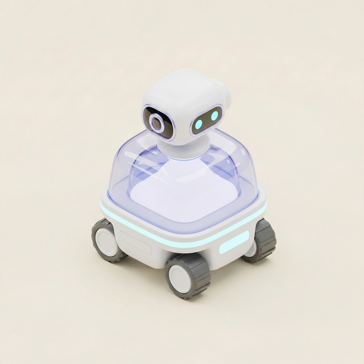 A sleek, modern robot with a white body, glowing blue lights, and a clear dome design, set against a neutral beige background.