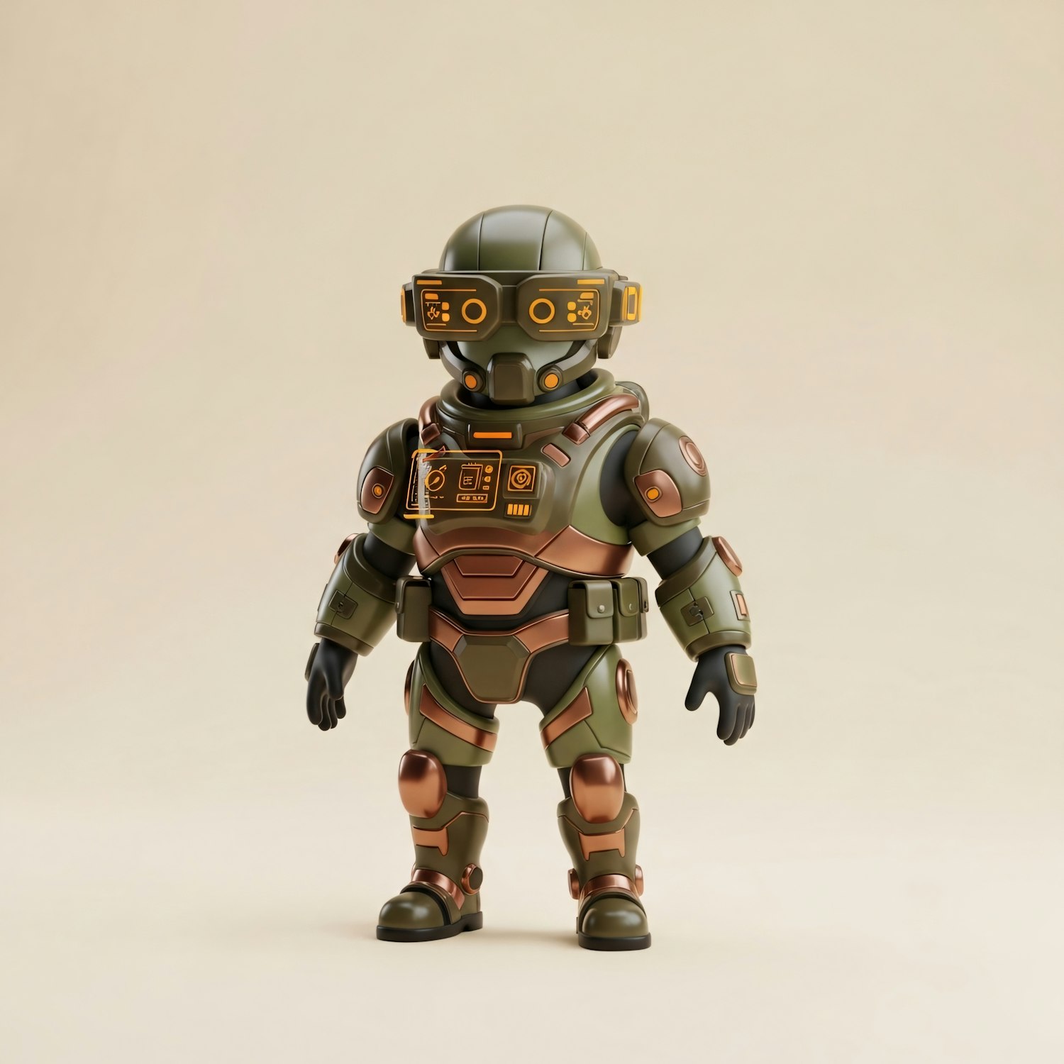 A detailed 3D model of a futuristic robot in green and bronze armor with glowing orange accents, set against a neutral background.