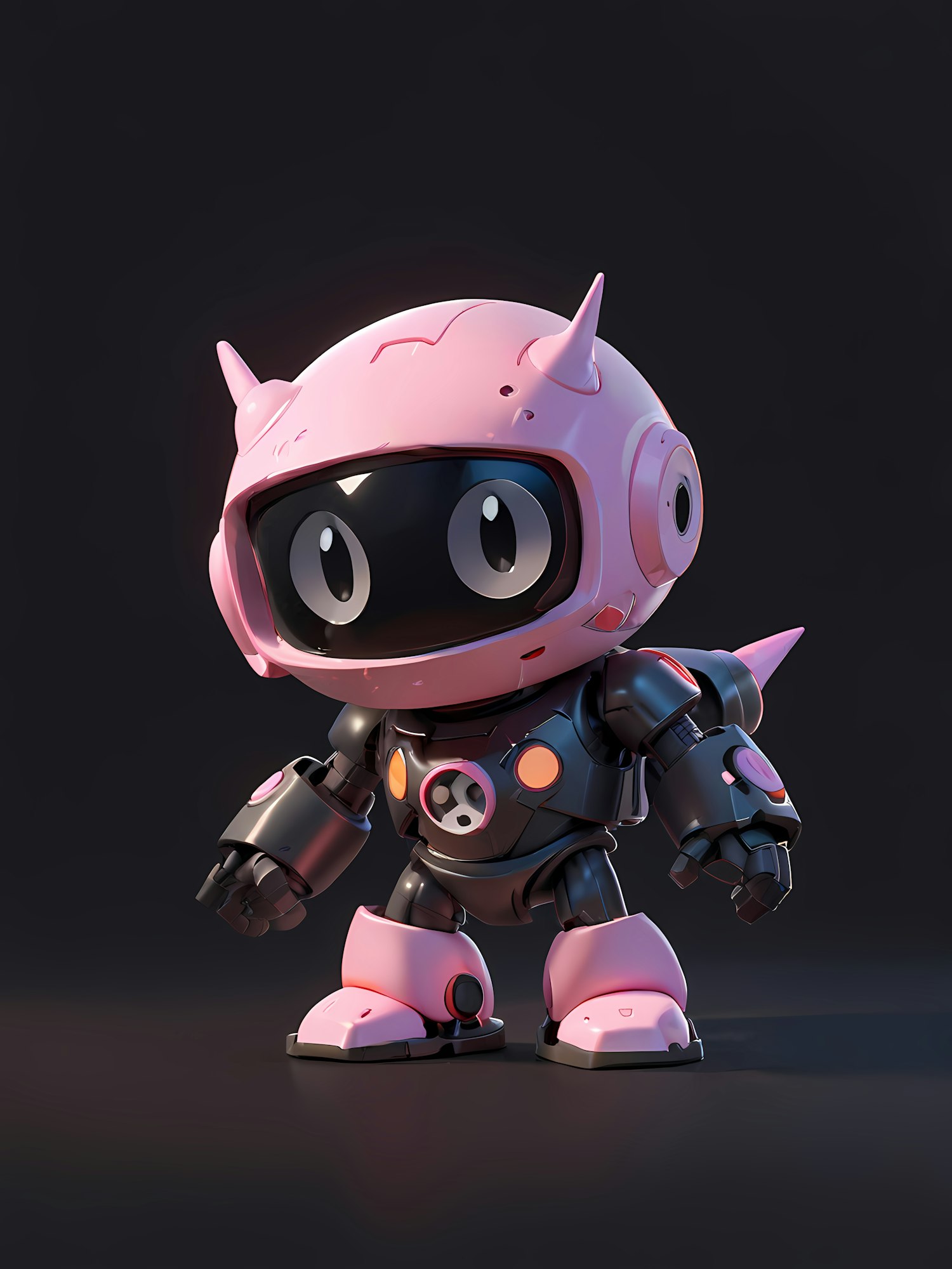 Adorable 3D robot with pink accents, horned helmet, and glowing details. Perfect mix of cute and futuristic design against a dark backdrop.