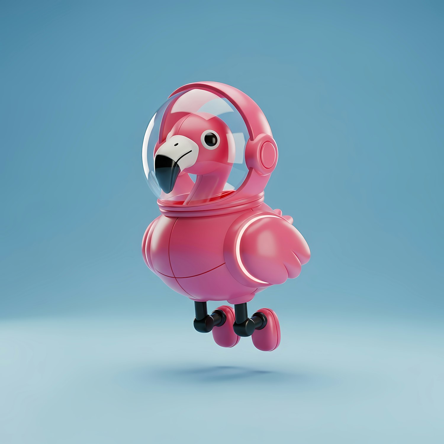 A cute 3D pink flamingo robot with a space helmet, set against a light blue background. Perfect blend of nature and futuristic design.