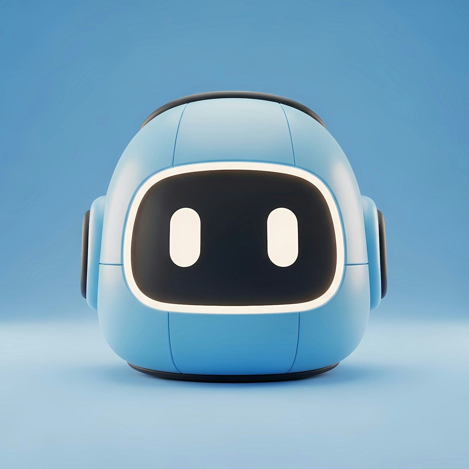 Adorable 3D robot head with a blue body and glowing white eyes on a black faceplate, set against a light blue background.