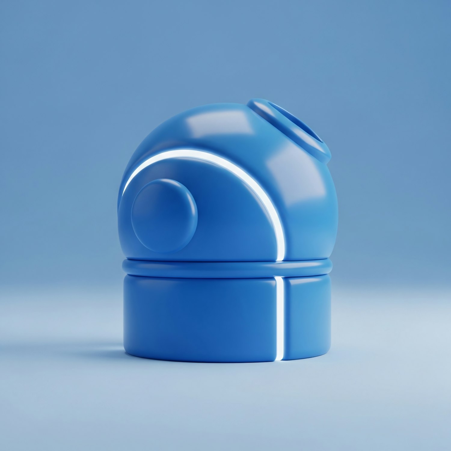 A sleek blue 3D-rendered object with a futuristic design, featuring smooth curves and glowing accents on a light blue background.