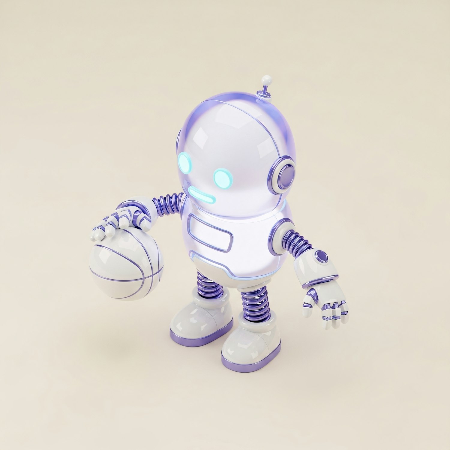 A cute robot with glowing blue eyes and a basketball in hand, showcasing a futuristic and playful design on a neutral background.