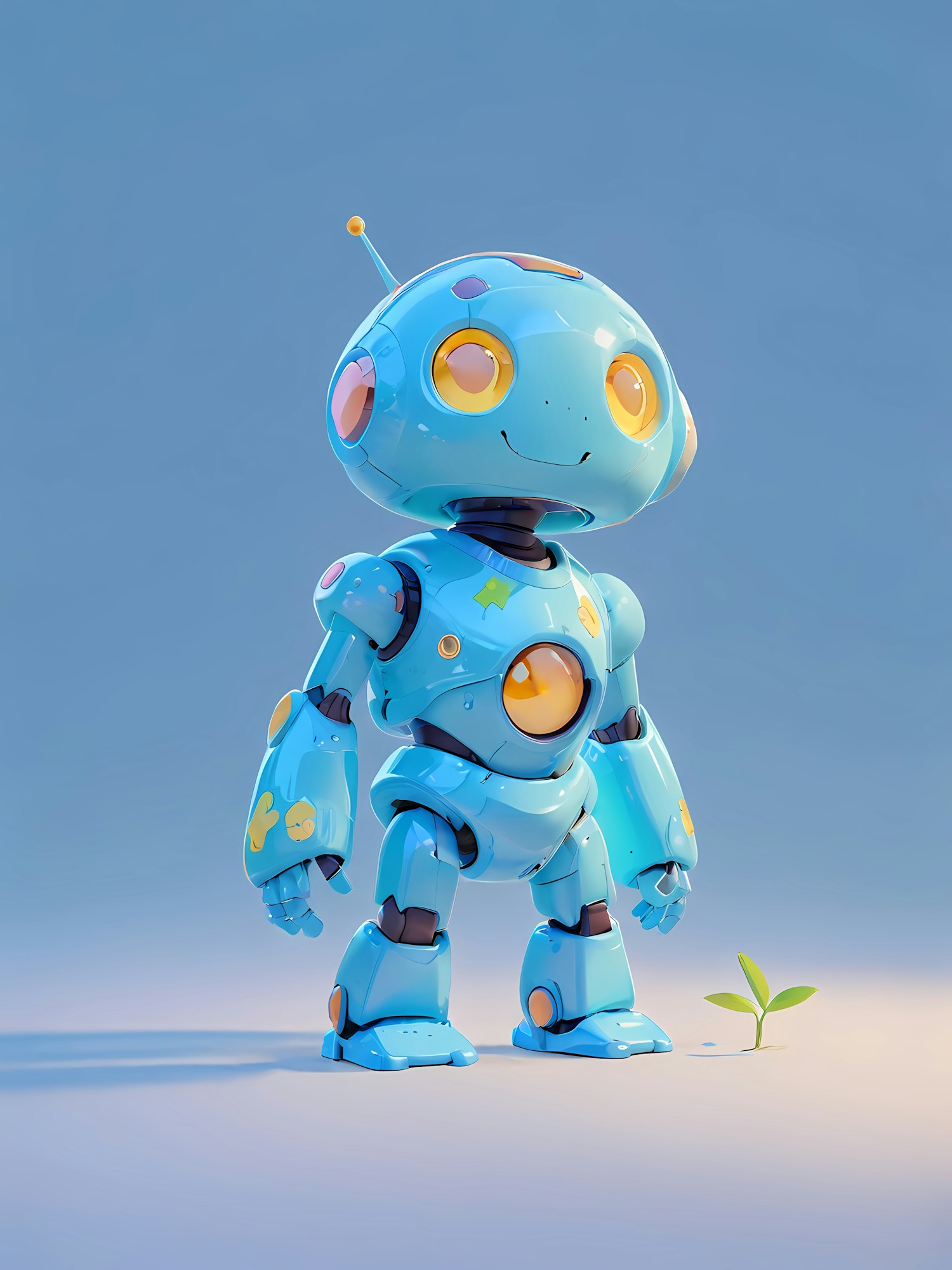Adorable blue robot with glowing yellow eyes and a sprout beside it, symbolizing growth and harmony. Futuristic and playful design.