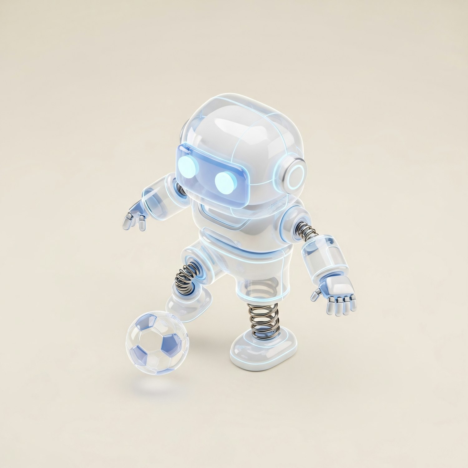 A futuristic 3D robot with glowing blue accents plays with a semi-transparent soccer ball on a neutral background.