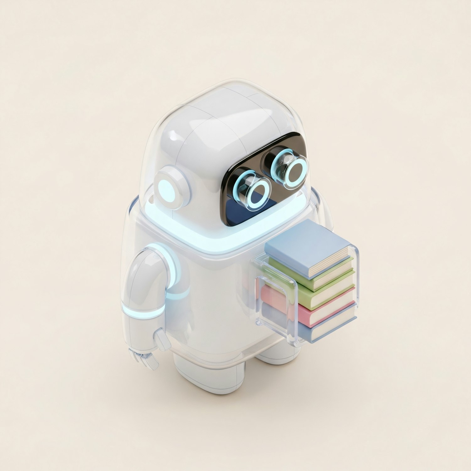 A futuristic robot with glowing accents holds a stack of colorful books, set against a neutral background, symbolizing technology and learning.