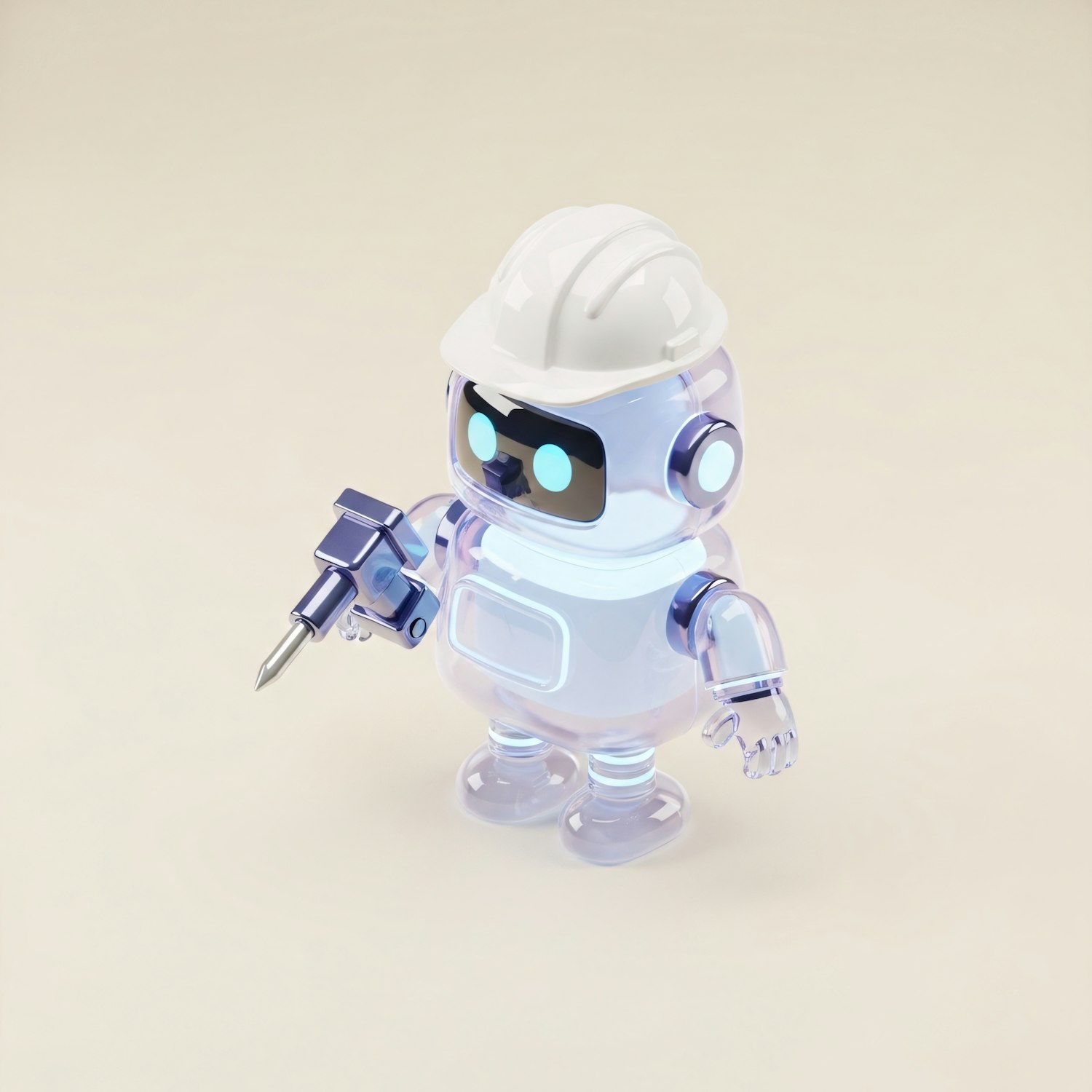 A translucent 3D robot with a construction helmet and drill tool, glowing blue eyes, and a sleek futuristic design on a neutral background.