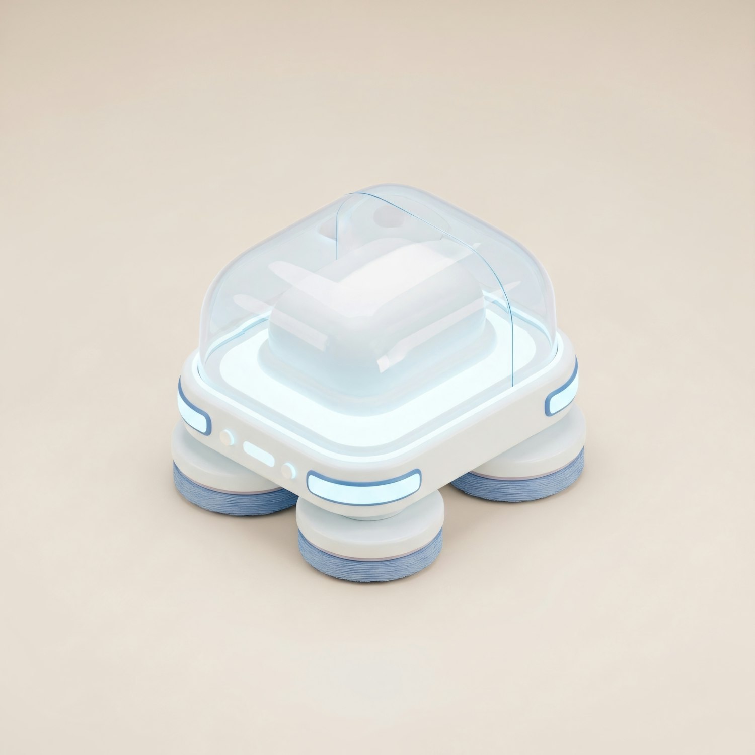 A sleek, futuristic robotic device with a transparent dome and glowing blue accents, set against a neutral beige background.