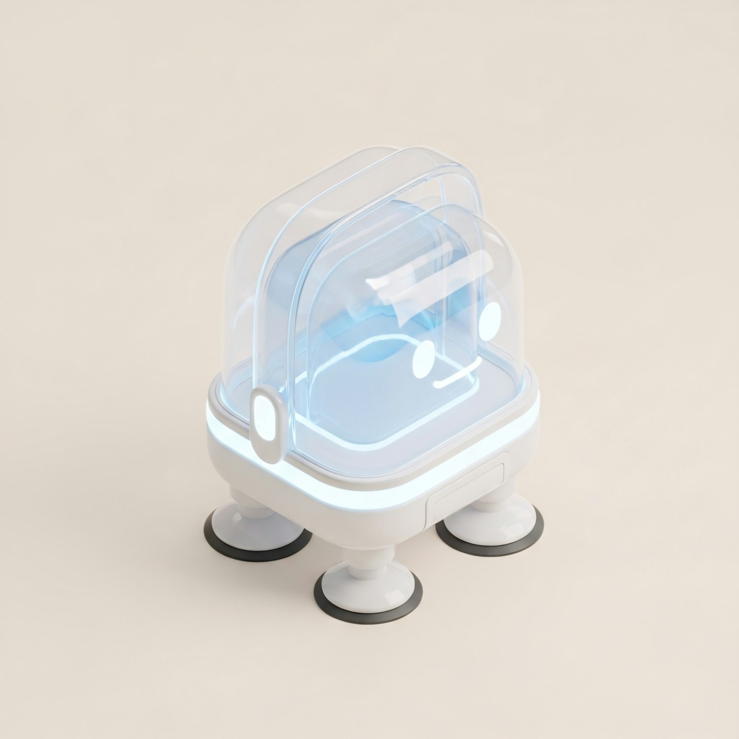 A sleek, futuristic robotic device with a glowing blue interior and suction-cup legs, set against a neutral beige background.