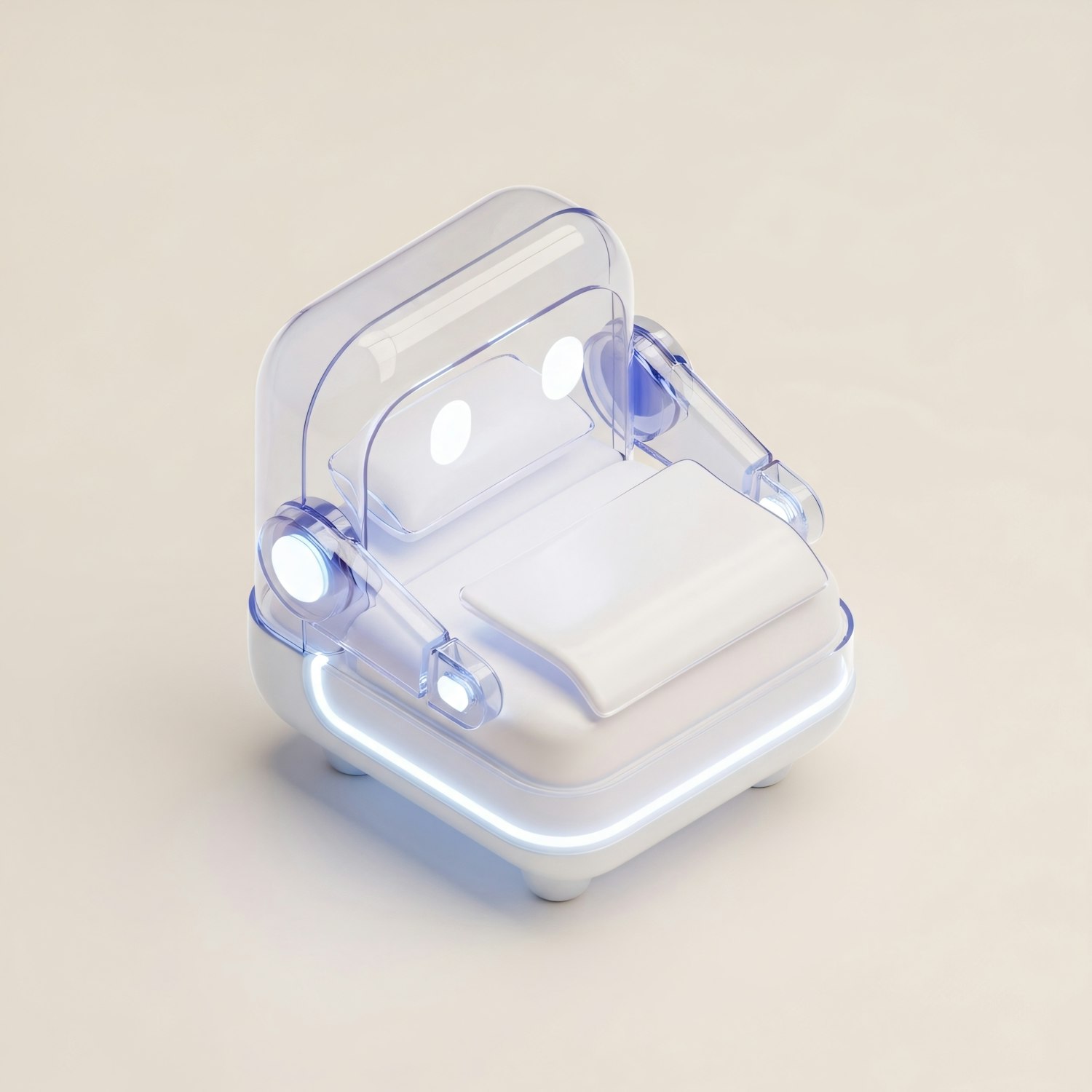 A sleek, futuristic robotic device with a transparent casing and glowing blue accents, set against a neutral background.