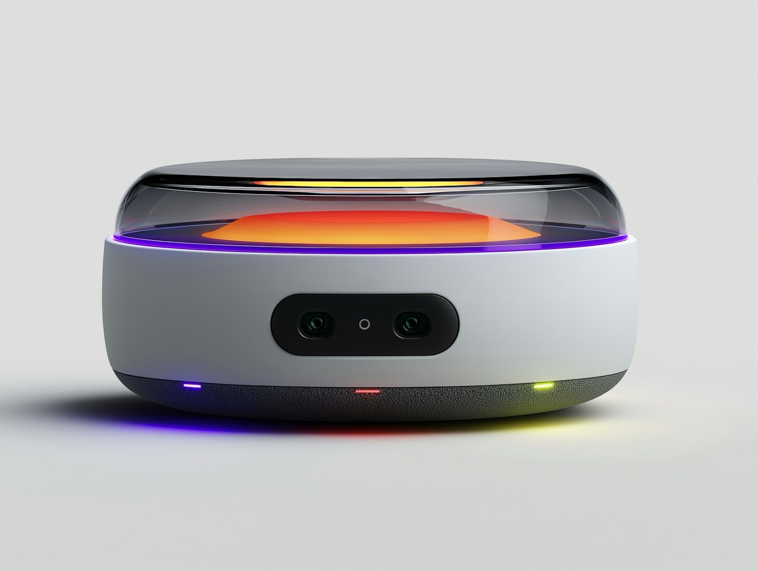 A futuristic robotic device with a glowing dome, camera sensors, and colorful LED accents, set against a minimalist background.