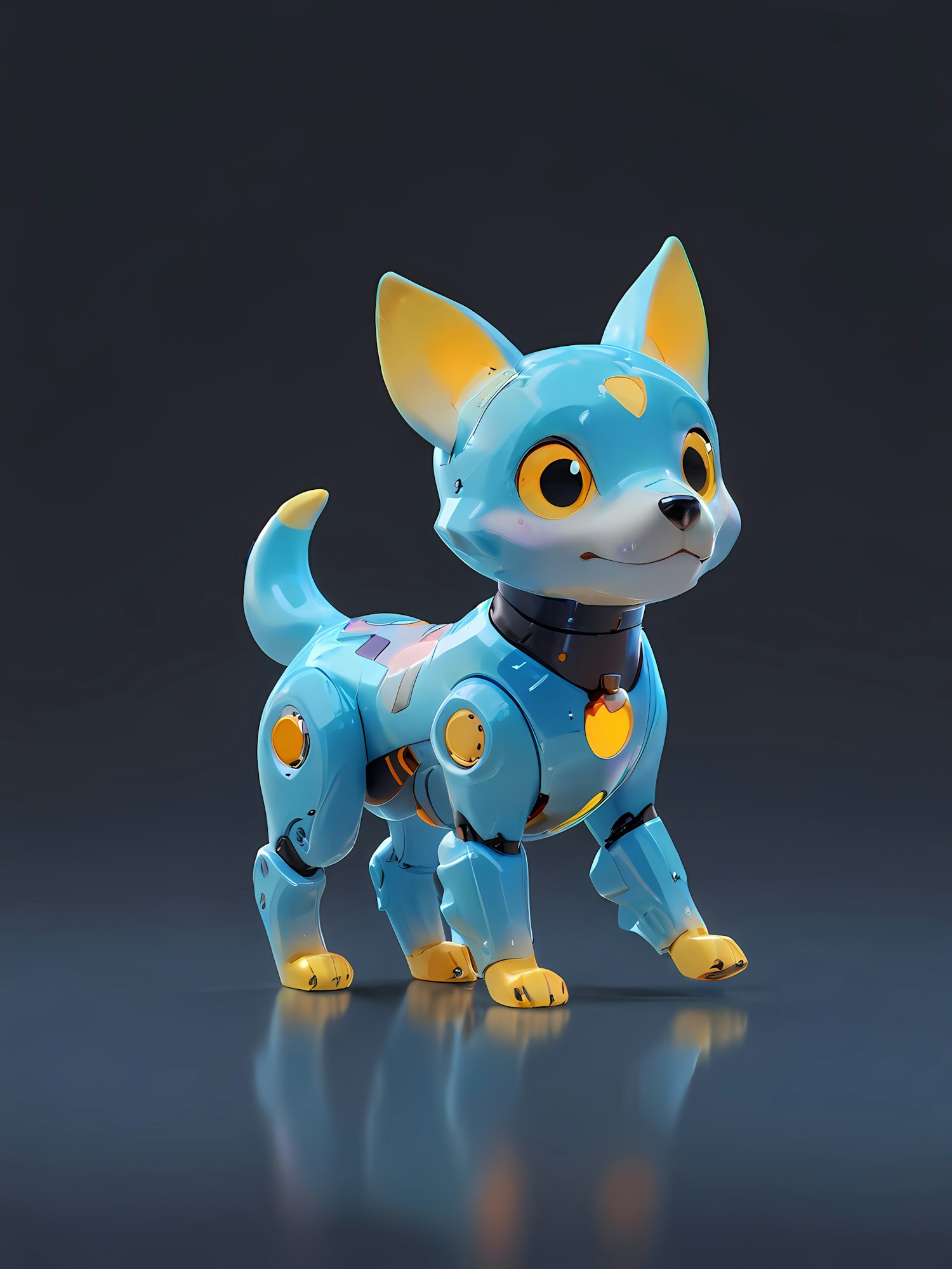 Adorable blue and yellow robotic dog with expressive eyes and a heart emblem, blending futuristic tech with a playful design.