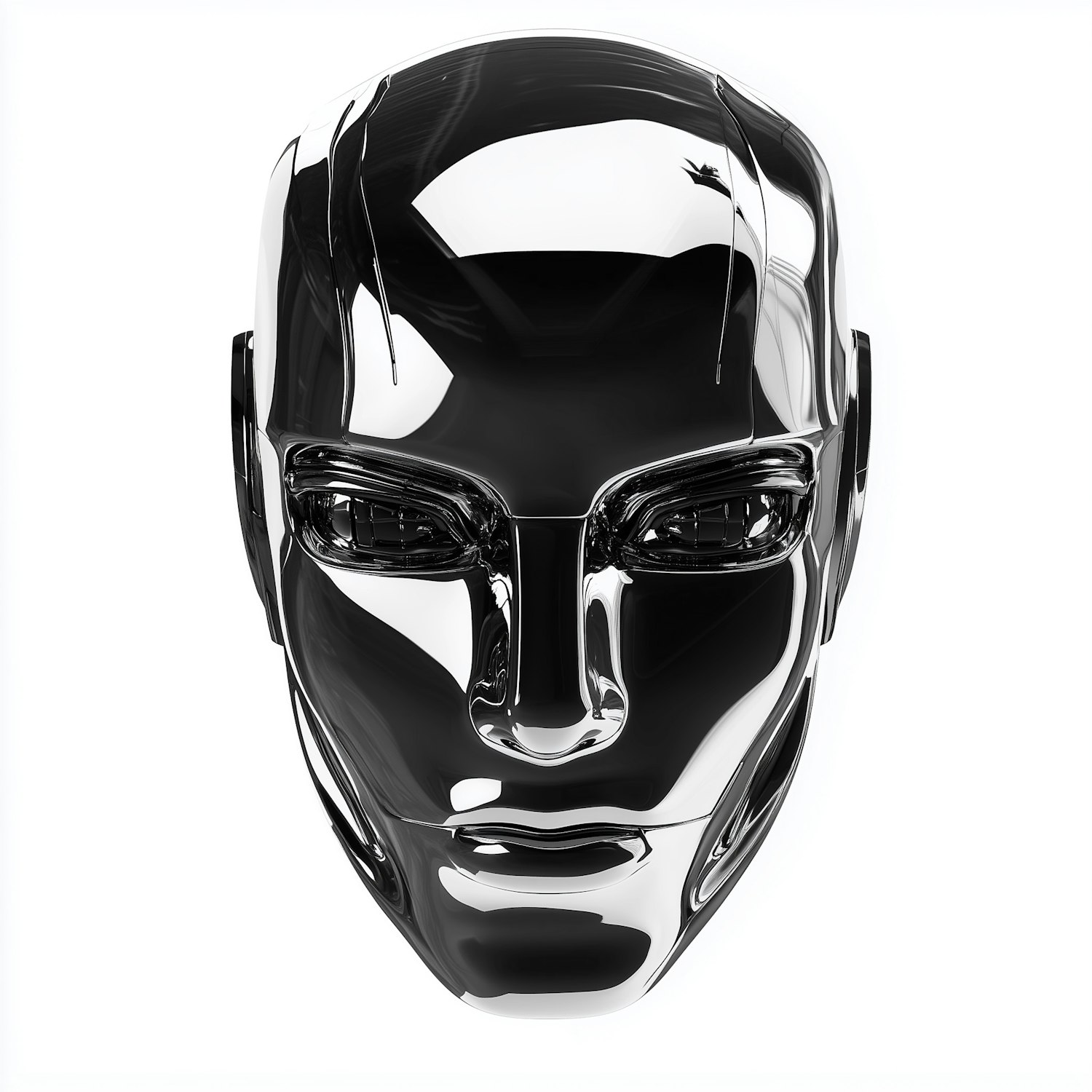 A futuristic chrome robotic face with reflective surfaces and sharp contours, set against a clean white background.