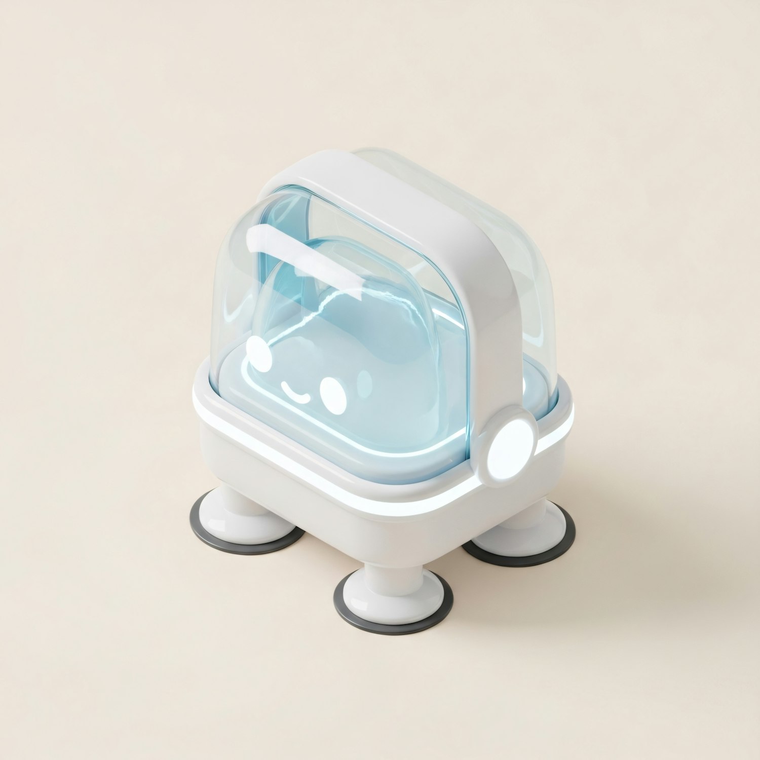 A modern, compact device with a friendly design, featuring a white base, blue dome, and a cute smiling face, resting on suction-cup legs.