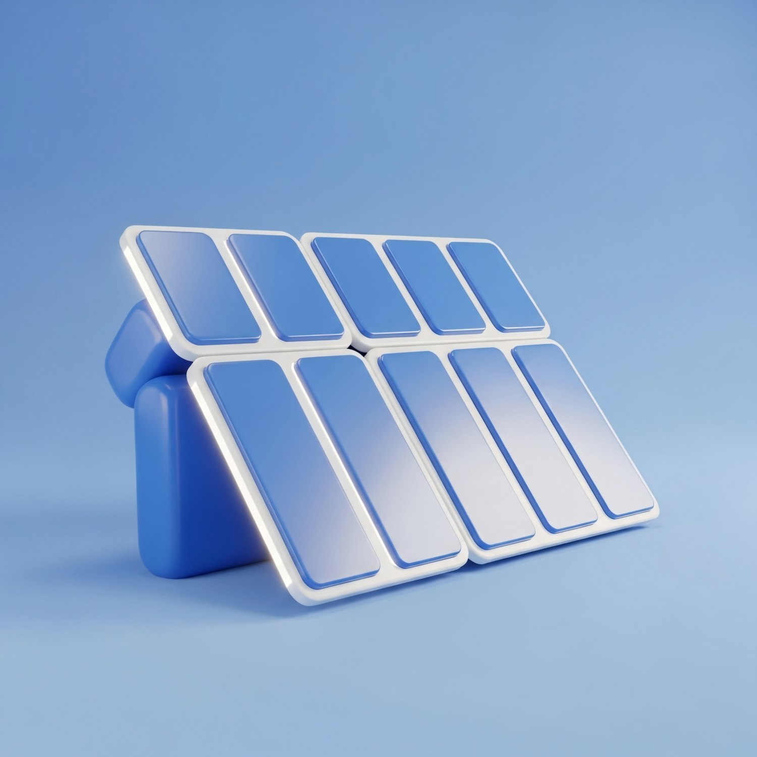 A modern 3D rendering of a solar panel array with a sleek design and a clean blue background, emphasizing renewable energy innovation.