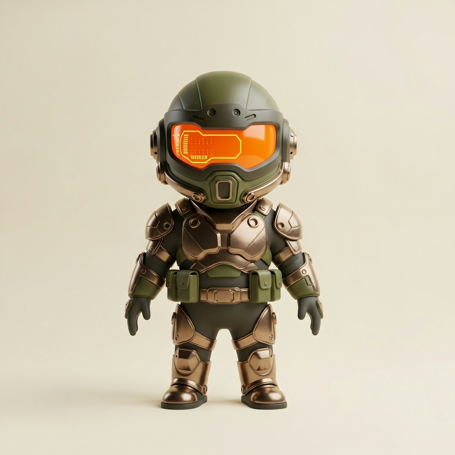 A stylized futuristic soldier figure with a green and bronze suit and an orange visor, standing against a neutral background.