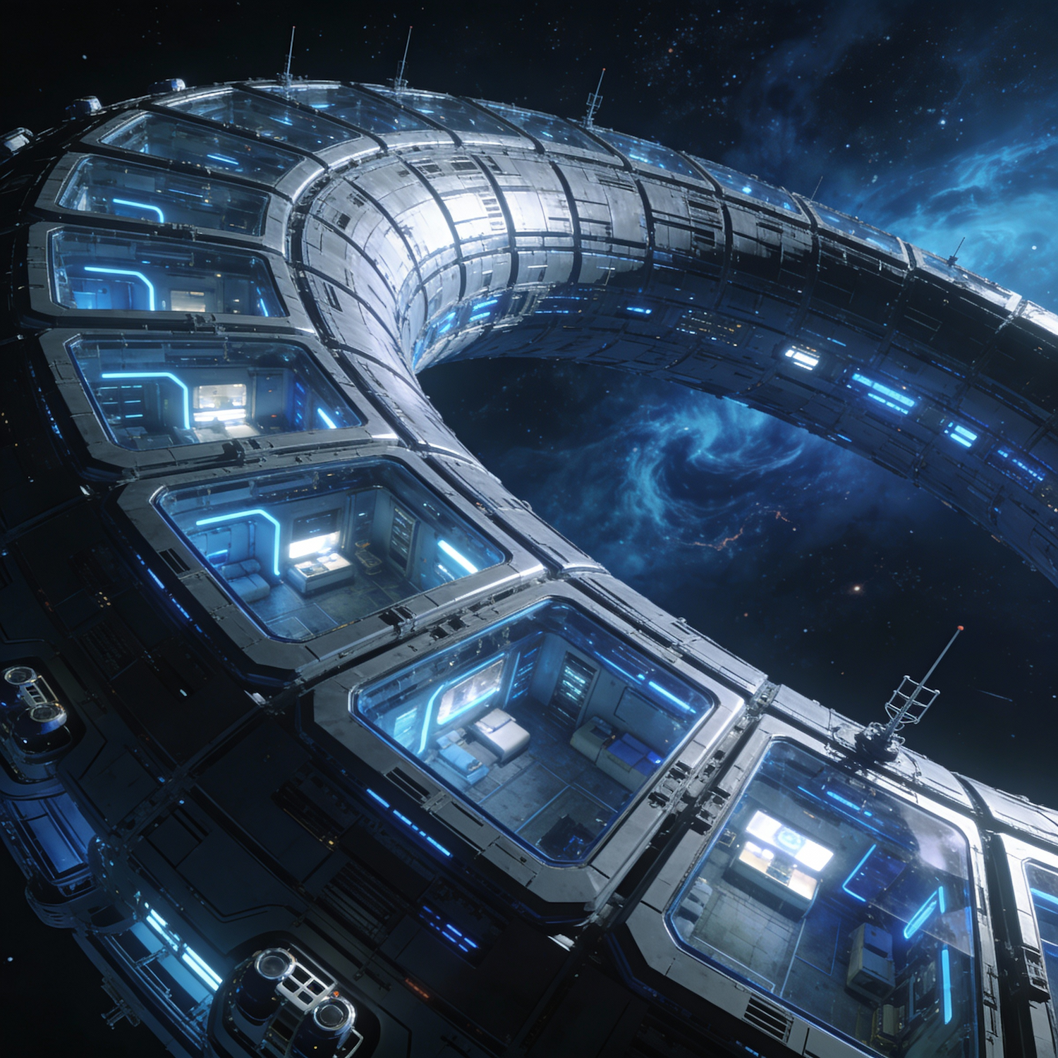 A futuristic donut like spaceship in a positioned diagonally with a blue and dark setting, made up of compatments creating enclosed rooms for space travel, showcasing advanced tecgnology and design