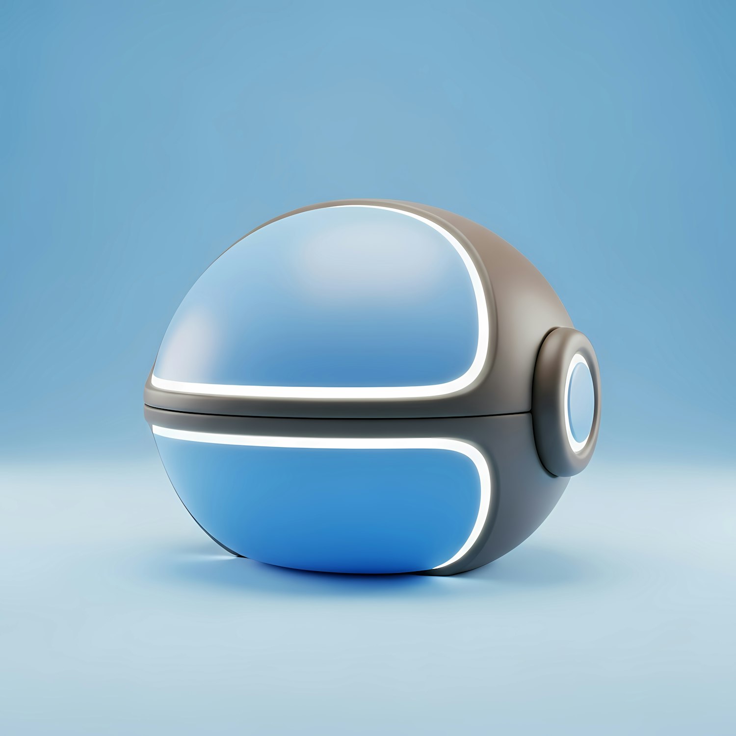 A sleek, futuristic spherical gadget with glowing white accents on a light blue background, showcasing modern design aesthetics.