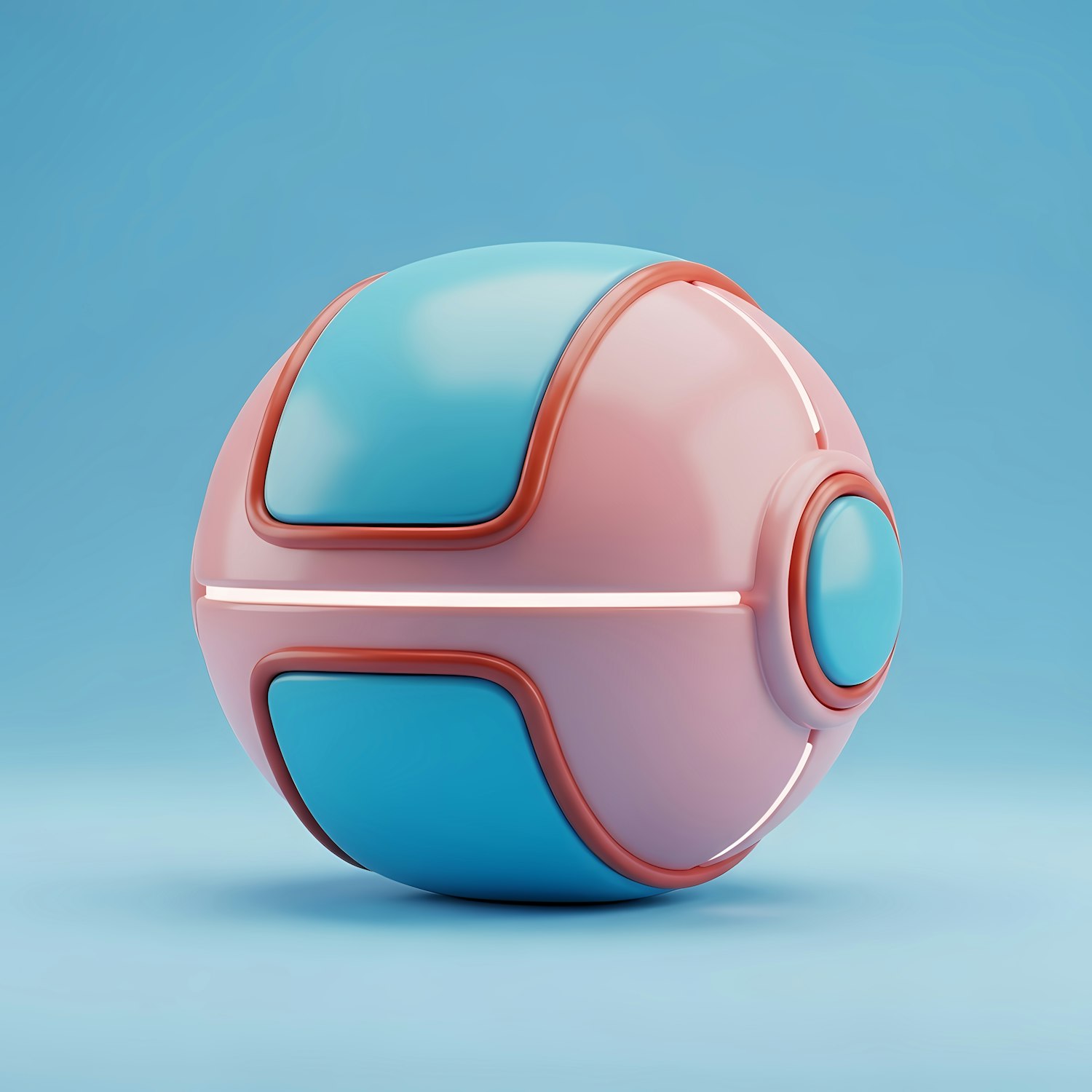 A sleek 3D-rendered sphere with pastel pink and blue sections, glowing accents, and a futuristic design against a light blue background.