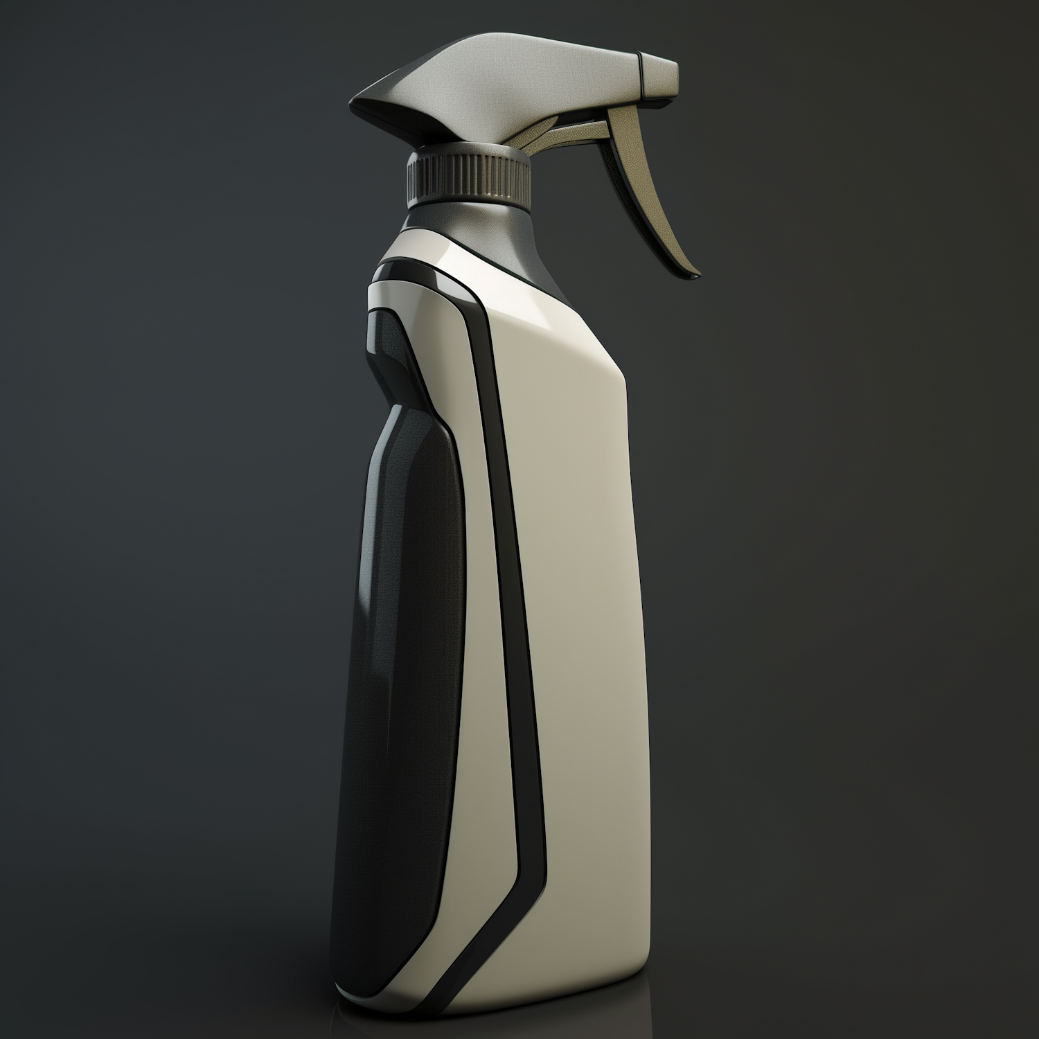 Modern spray bottle with a sleek beige and black design, ergonomic handle, and minimalist aesthetic on a dark gradient background.