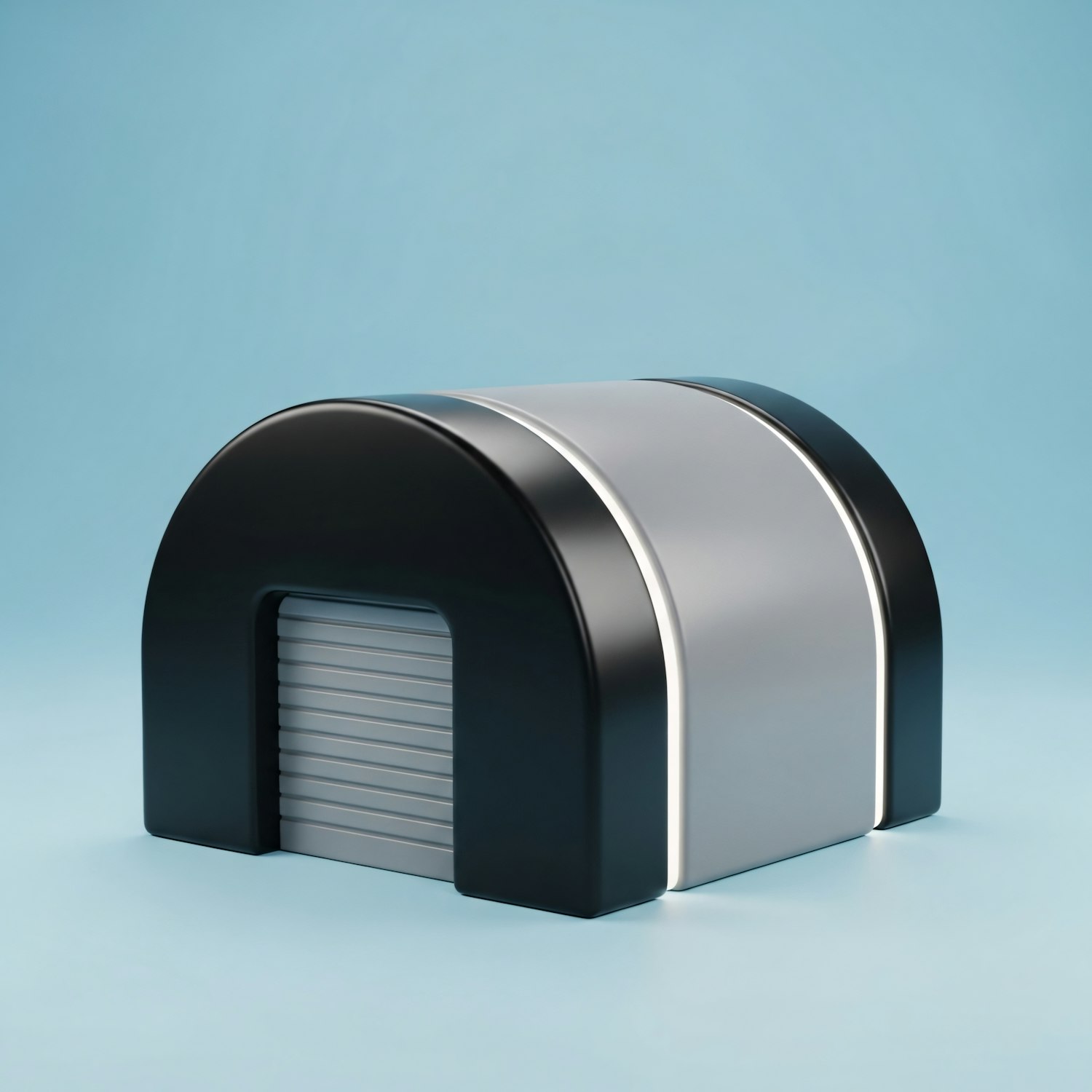 A sleek, modern arched structure with black and silver tones, set against a light blue background, showcasing a futuristic design.