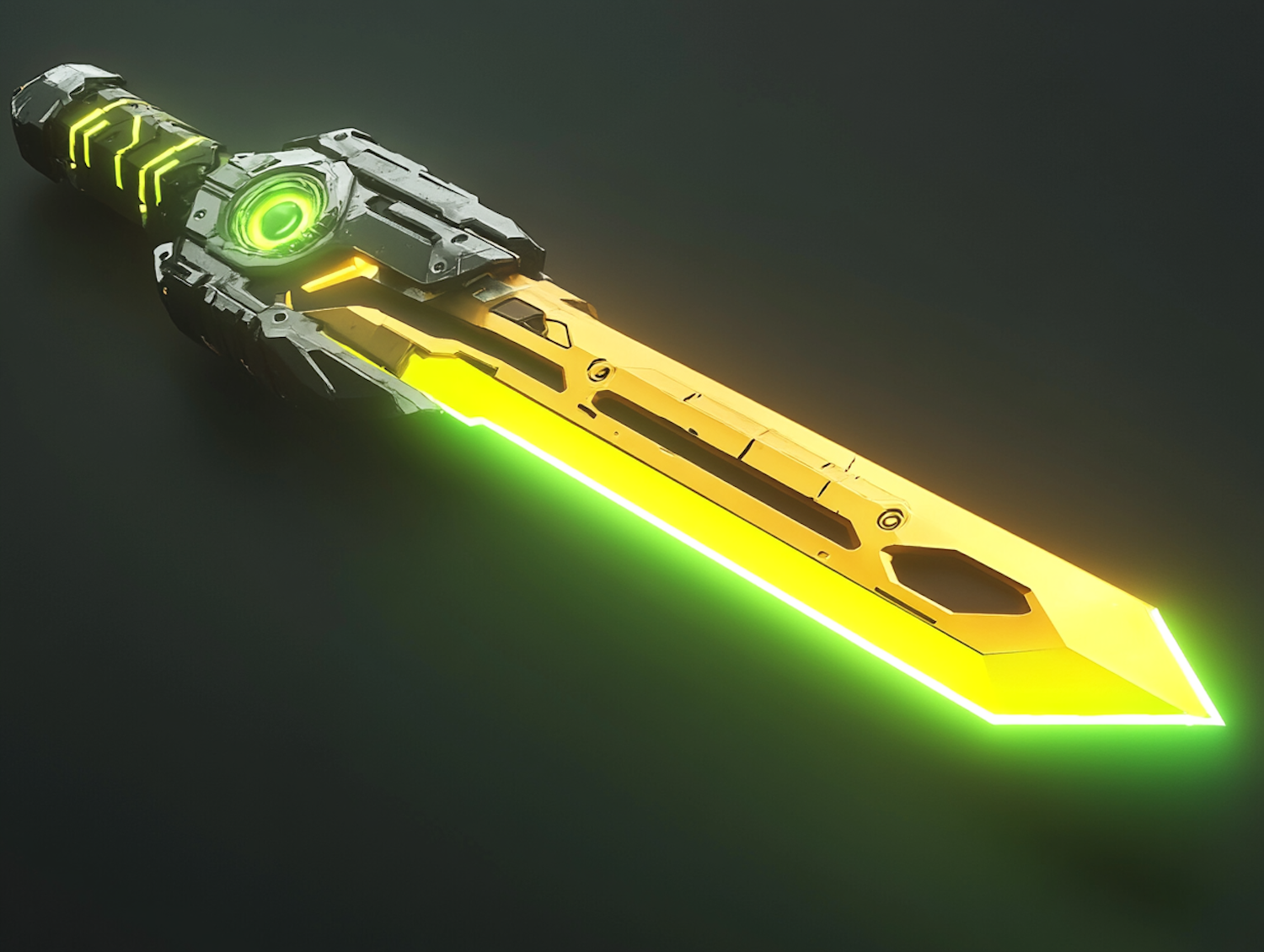 Futuristic sword with a glowing green edge and vibrant yellow blade, featuring a metallic hilt with a central green light.