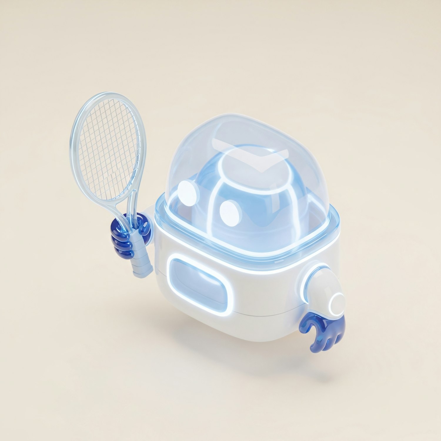 A futuristic 3D robot with a transparent dome head and a tennis racket, set against a neutral background.