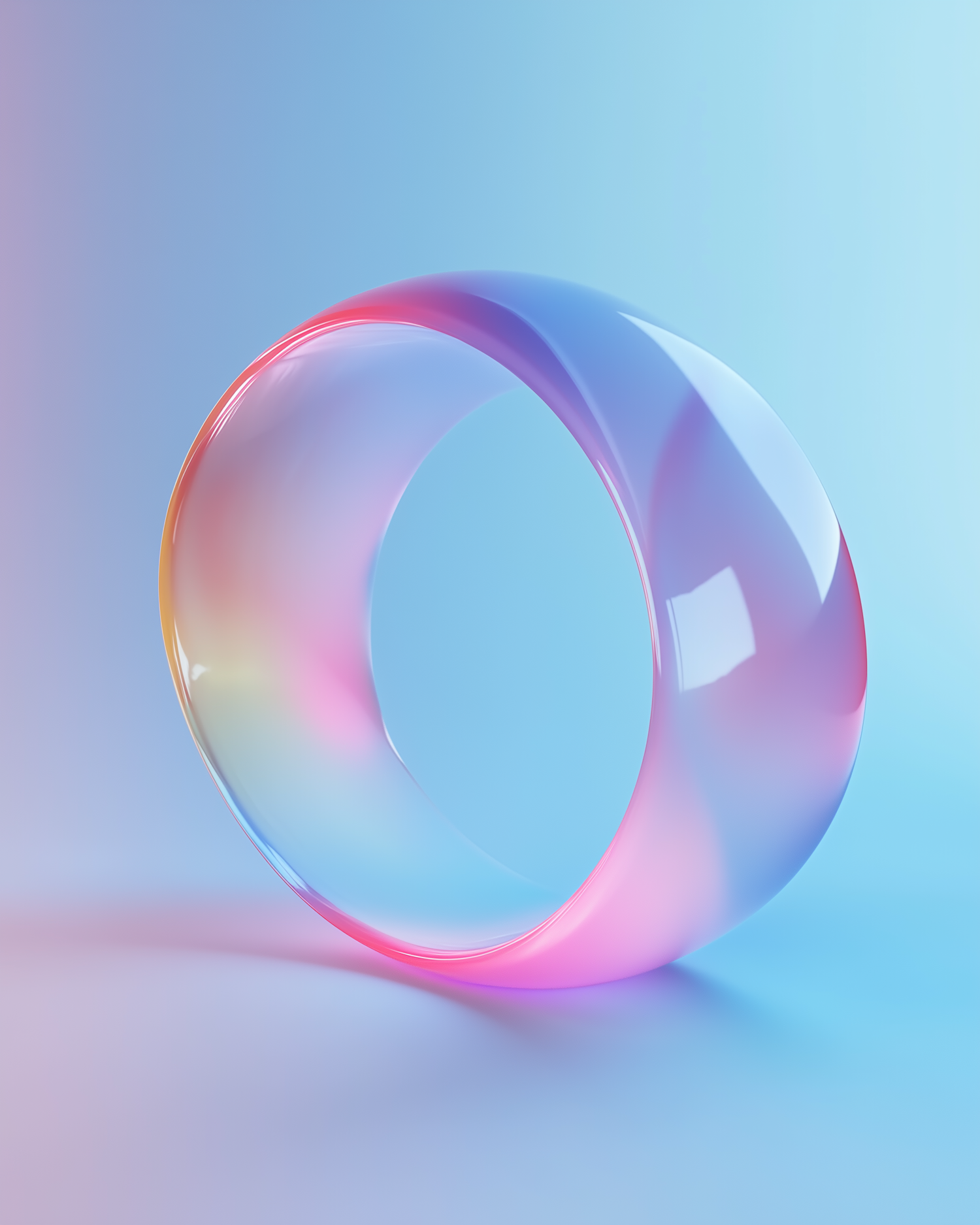 A glossy, pastel-colored torus with soft pink, blue, and yellow hues floating on a dreamy gradient background.