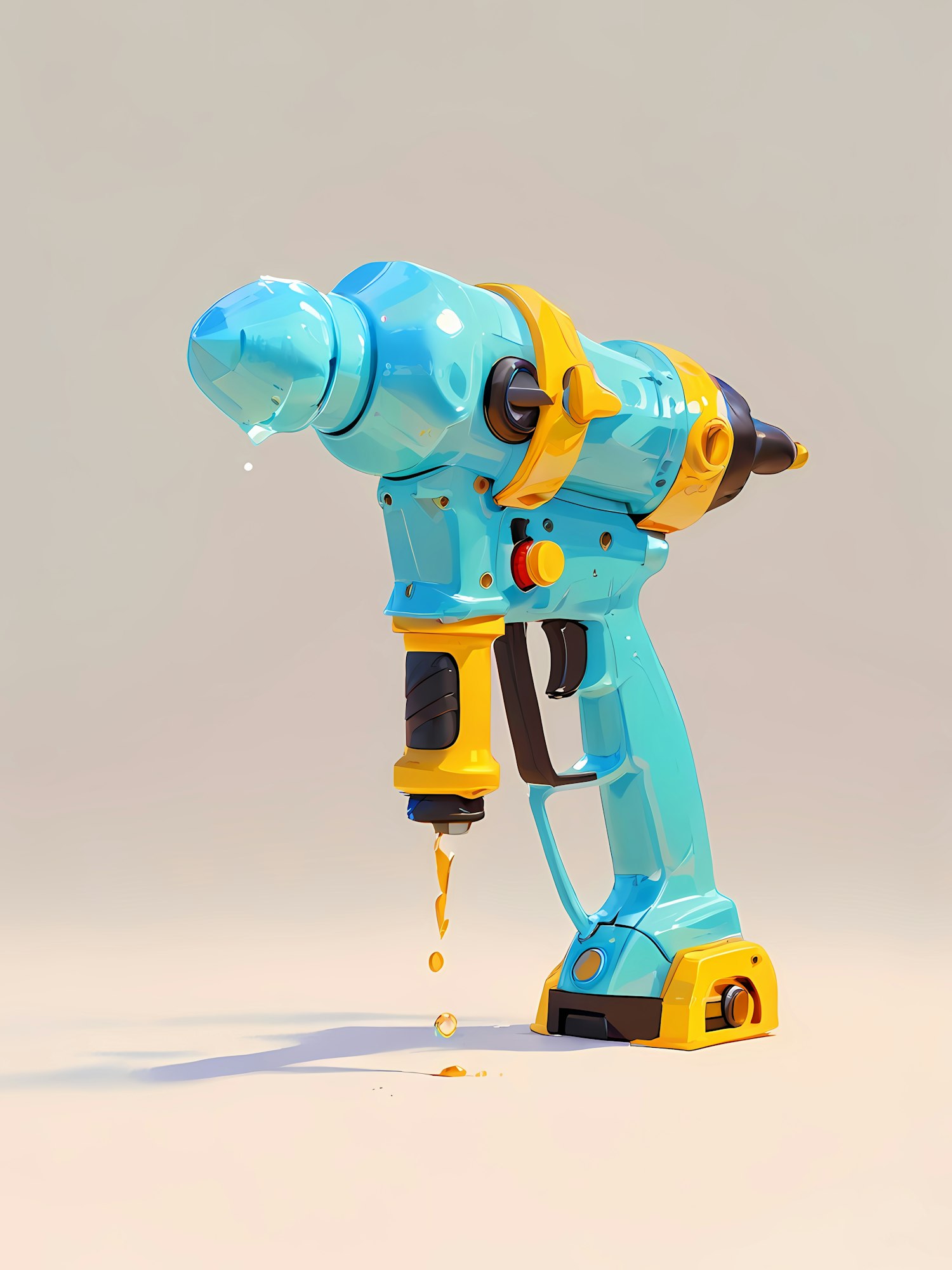 A playful 3D-rendered power drill in blue and yellow, dripping golden liquid from its nozzle, set against a neutral background.