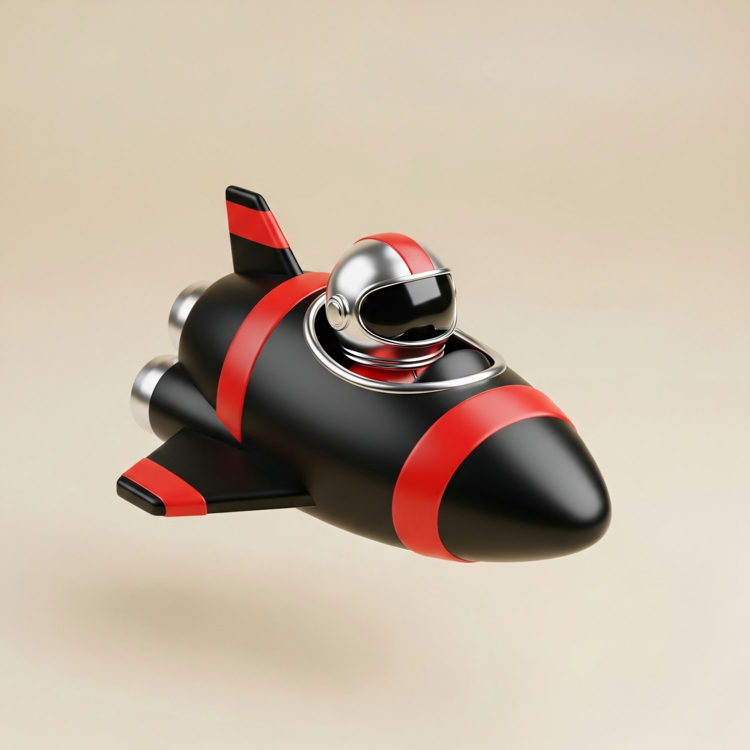 A futuristic black and red toy rocket with a silver astronaut figure, set against a neutral background, showcasing sleek design.