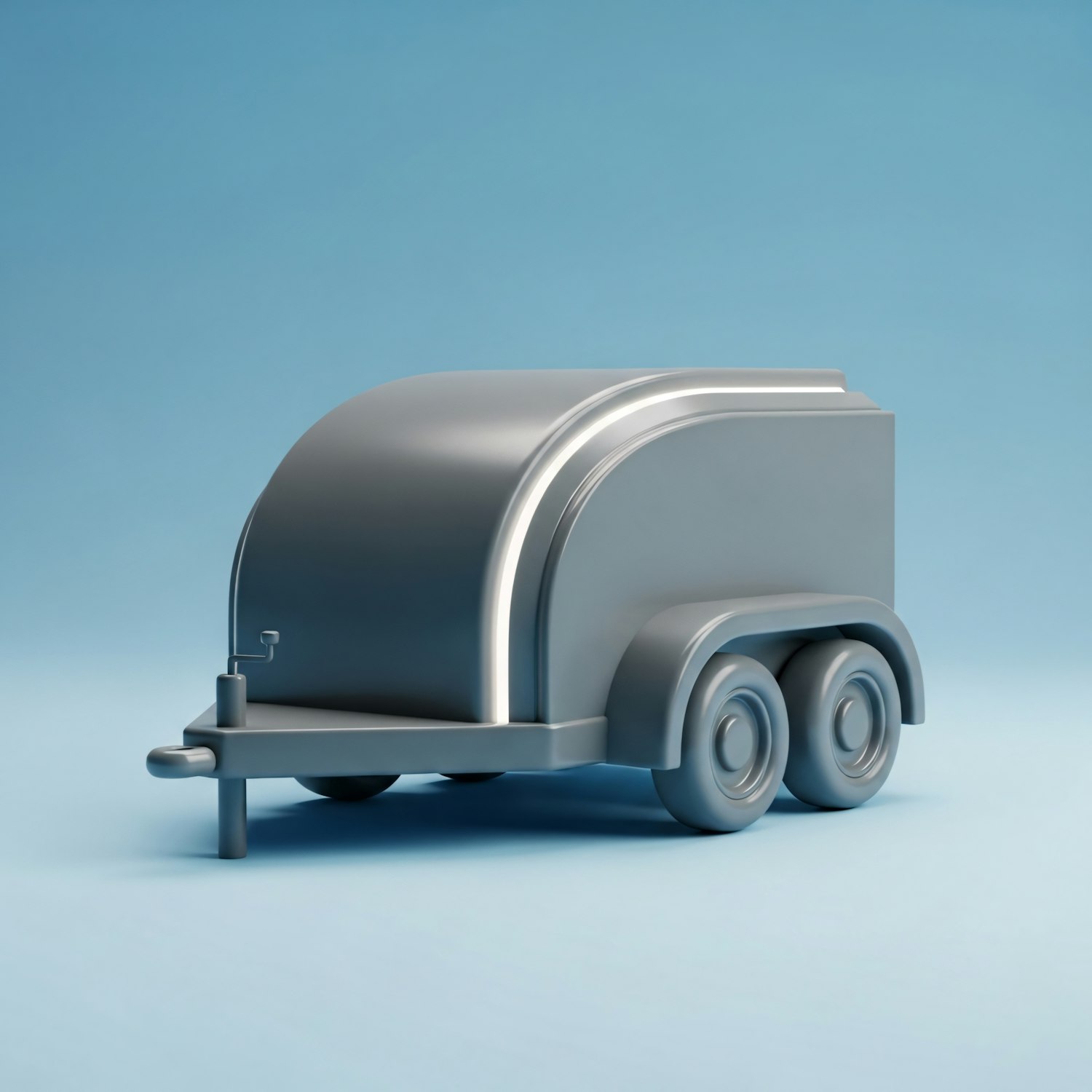 A modern, metallic trailer with a sleek design and curved edges, set against a gradient blue background, showcasing its futuristic style.