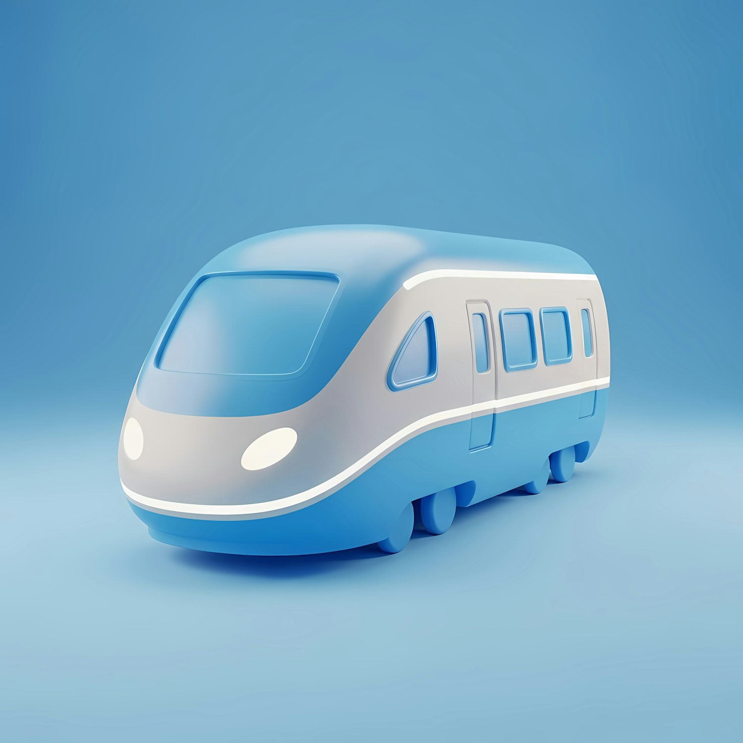 A sleek 3D illustration of a modern blue and white train with a futuristic design, set against a gradient blue background.