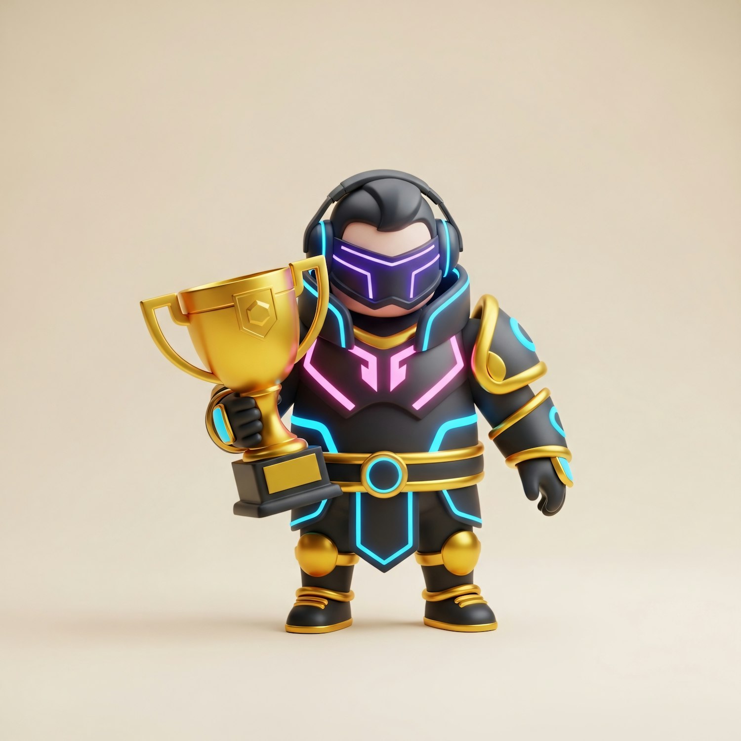 A 3D-rendered futuristic character in a glowing suit holds a golden trophy, symbolizing achievement and victory in a sci-fi theme.