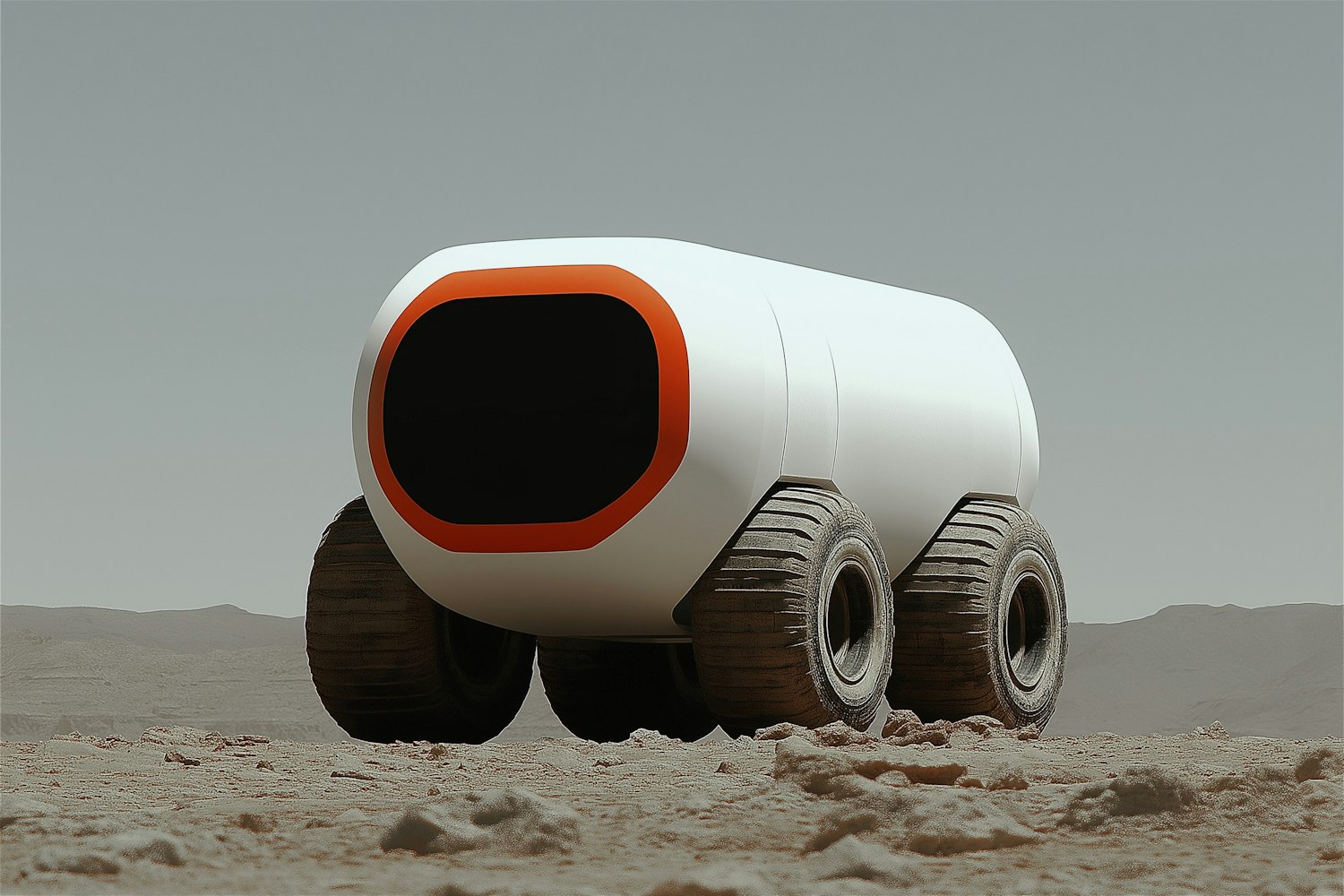 Futuristic rover with sleek design on a barren landscape, featuring large wheels and a white body with orange accents.