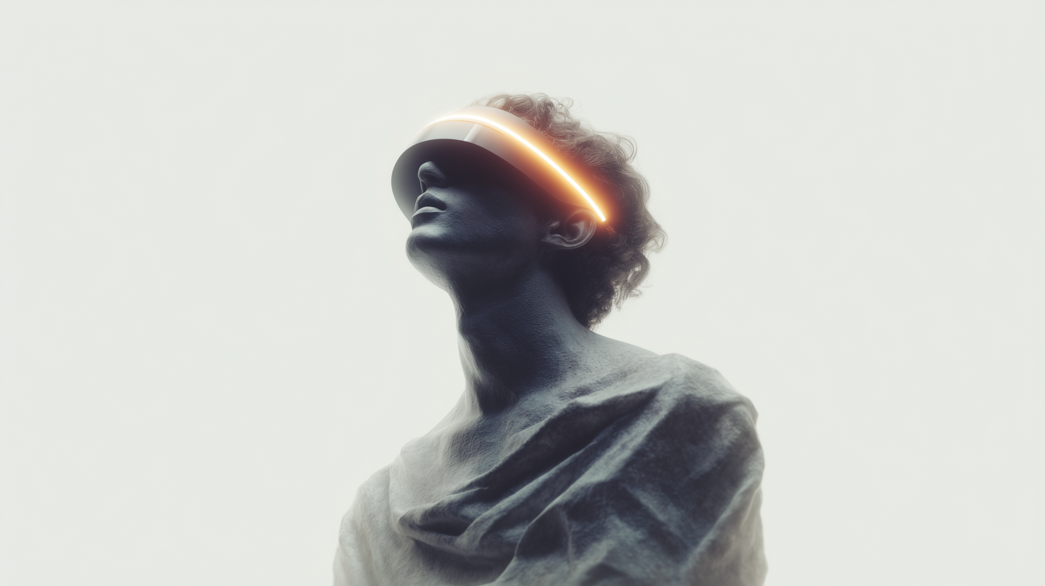A futuristic figure wearing a glowing visor, blending classical and modern aesthetics in a minimalistic setting.