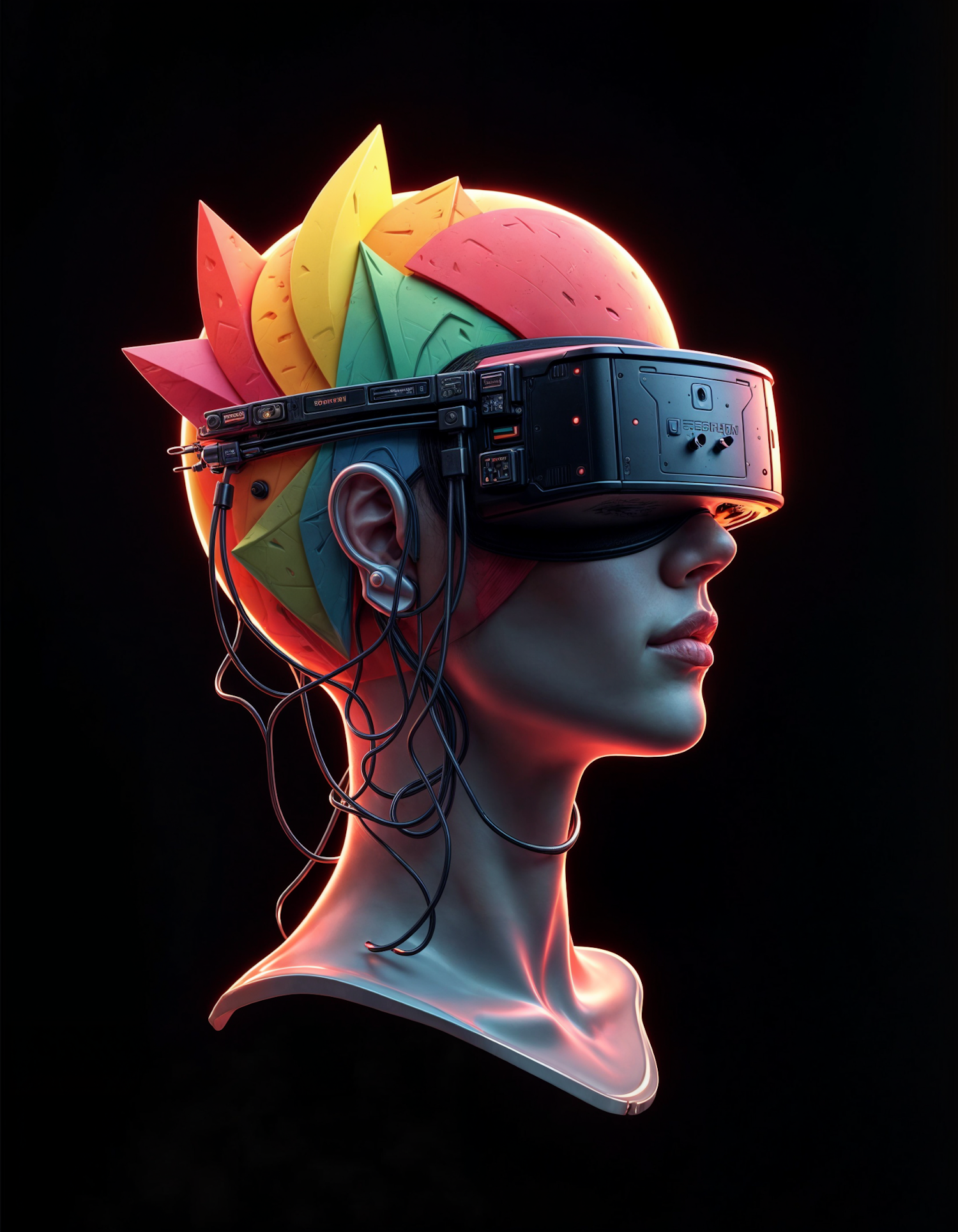 Futuristic cyberpunk portrait of a person with a glowing VR headset and colorful geometric headgear on a dark background.