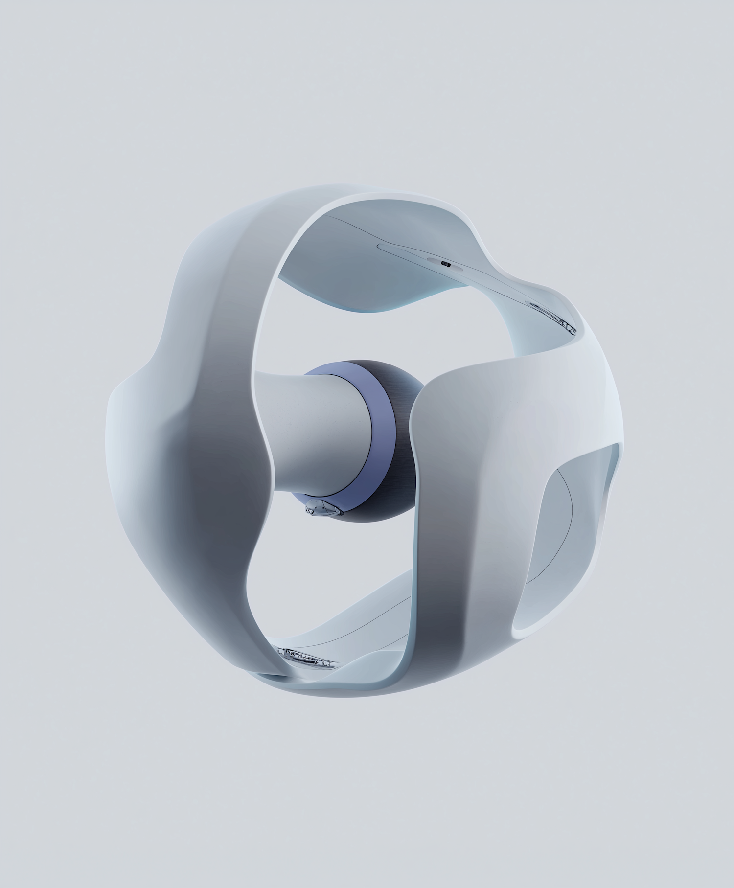 Futuristic wind turbine design with a sleek, white, aerodynamic shell and a central blue-accented cylinder on a light gray background.