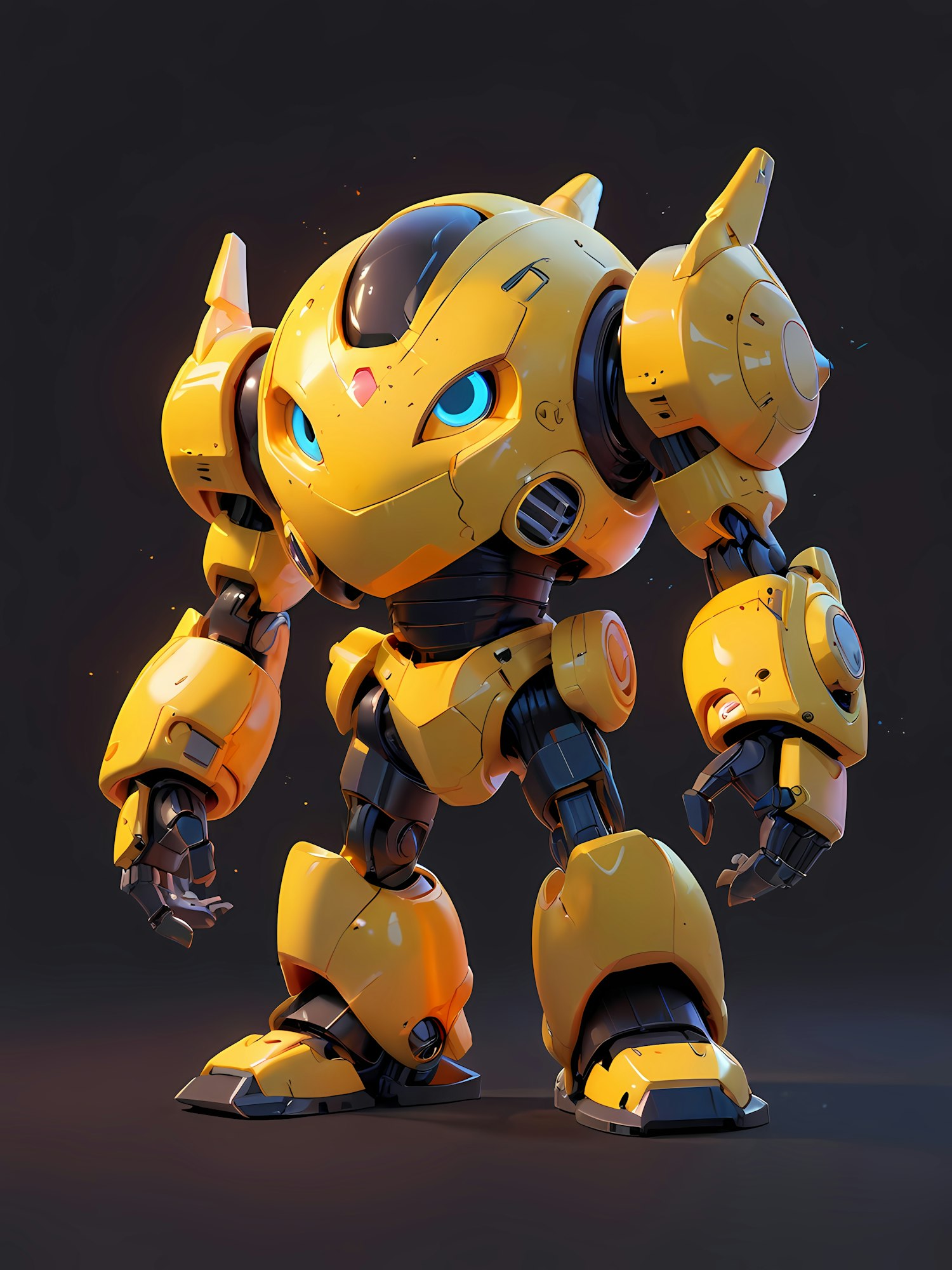 A sleek yellow robot with glowing blue eyes and detailed armor stands confidently against a dark background, exuding futuristic charm.