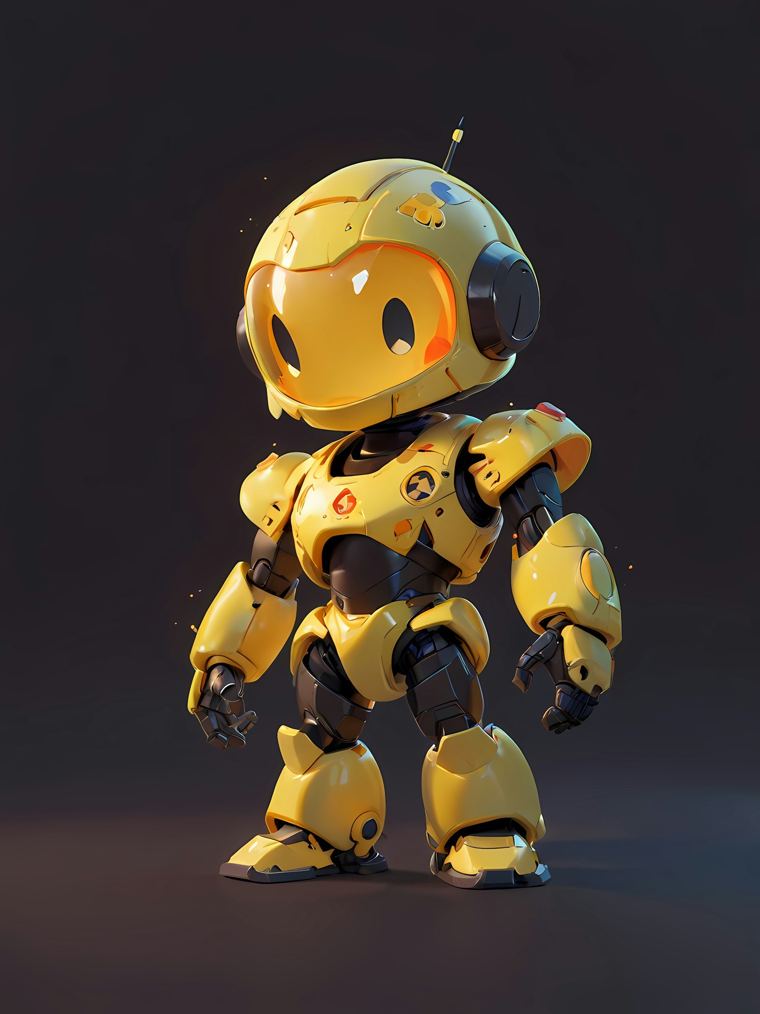 A cute yellow robot with a glossy visor and black accents, standing confidently in a futuristic 3D render against a dark background.