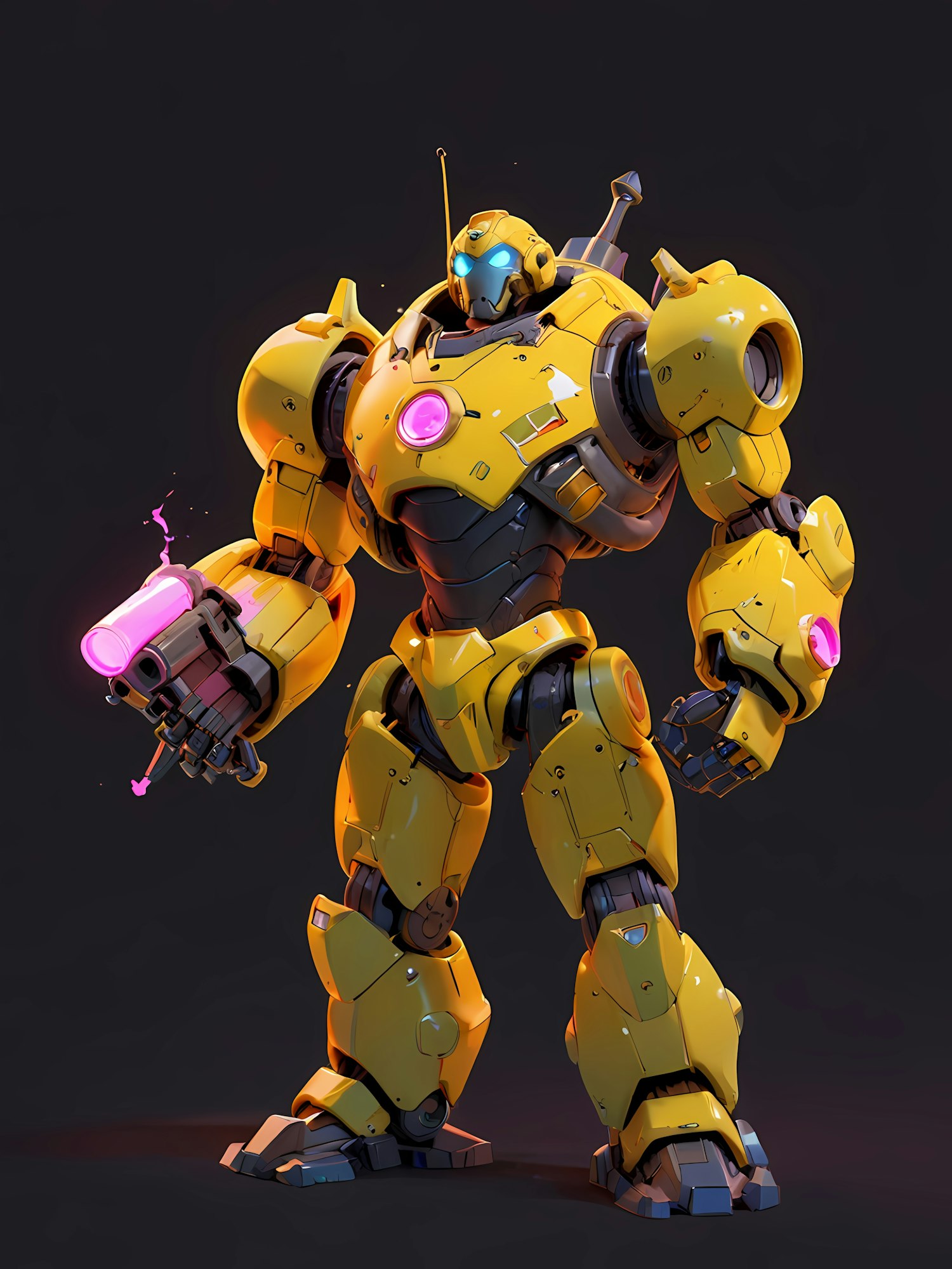 Futuristic yellow robot with glowing blue eyes and pink energy weapon, standing in a powerful pose against a dark background.