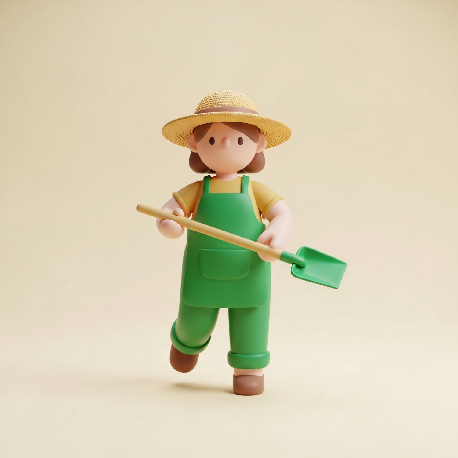 A charming 3D illustration of a gardener character in a green apron and straw hat, holding a small shovel against a beige background.