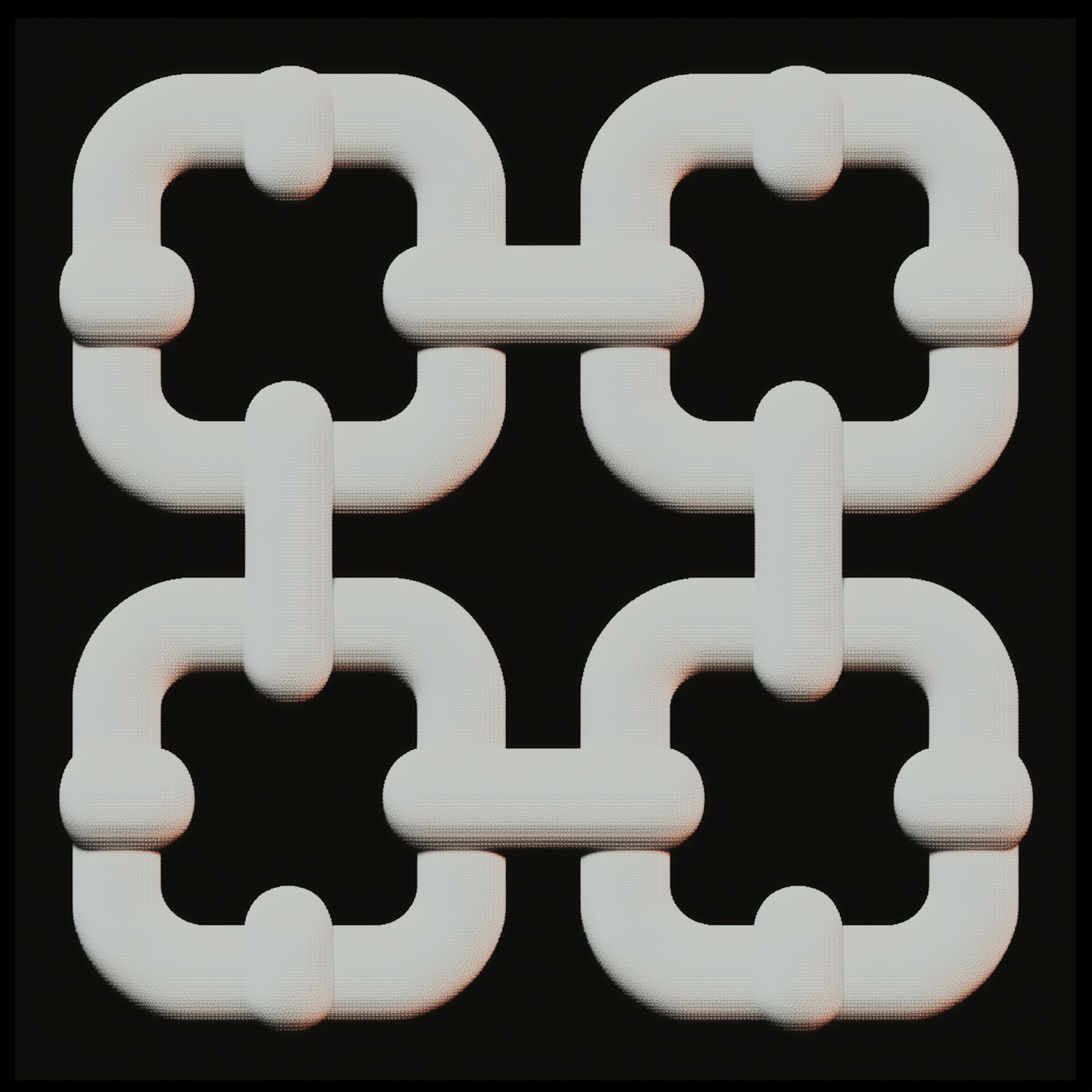 Minimalistic geometric pattern of white chain links on a black background, creating a modern and symmetrical design.