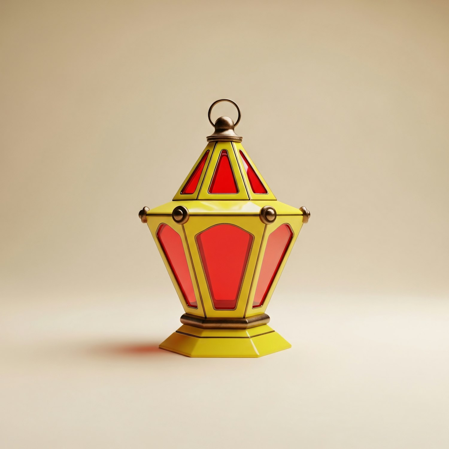 A colorful lantern with a yellow frame and red panels, set against a neutral background, showcasing its geometric and vibrant design.