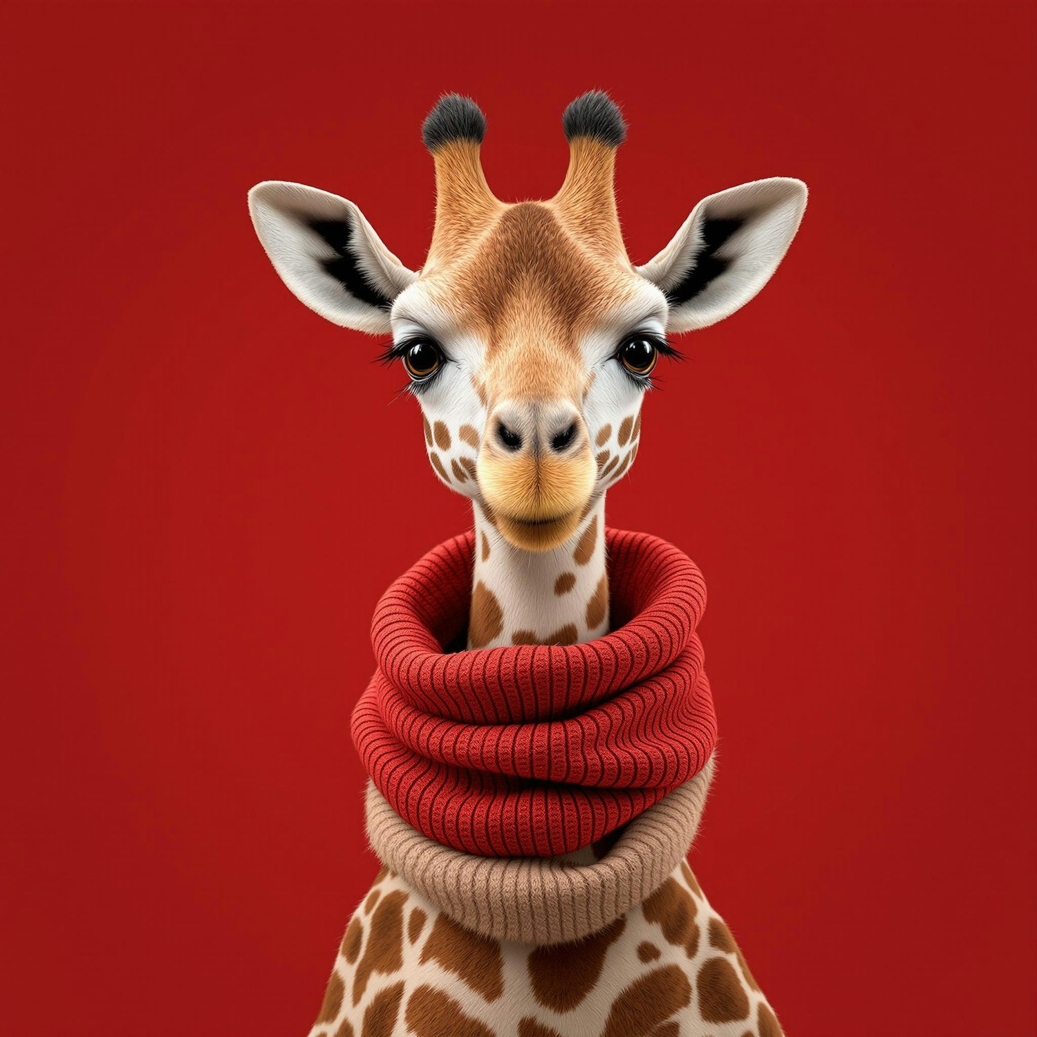 A charming giraffe wearing a red and beige scarf against a bold red background, blending realism with a whimsical touch.