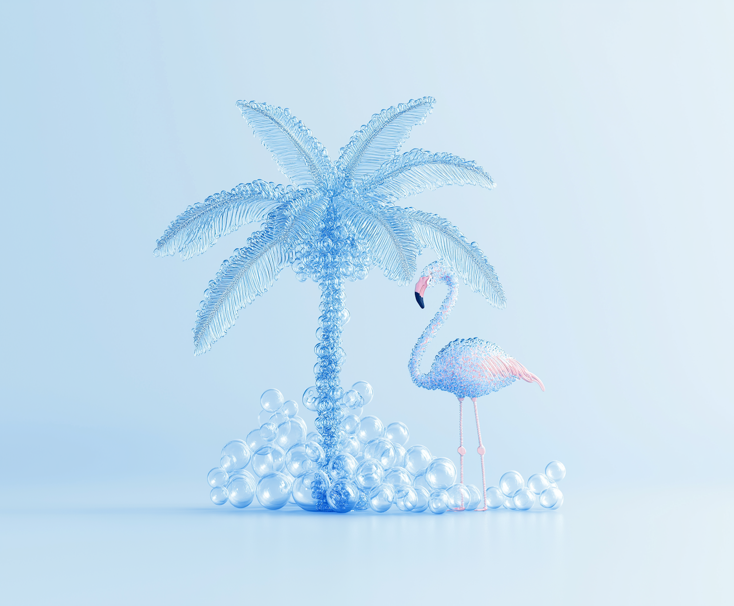 Surreal bubble art featuring a palm tree and flamingo in translucent blue and pink hues against a light blue background.