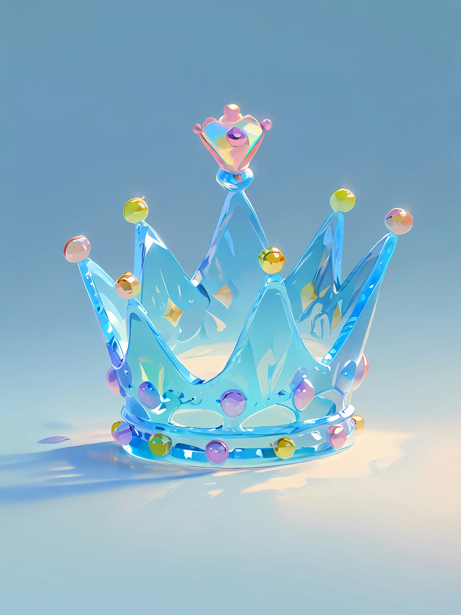 A dreamy glass crown with pastel gems and a heart-shaped top, set against a soft blue background. Perfect for whimsical or fantasy themes.