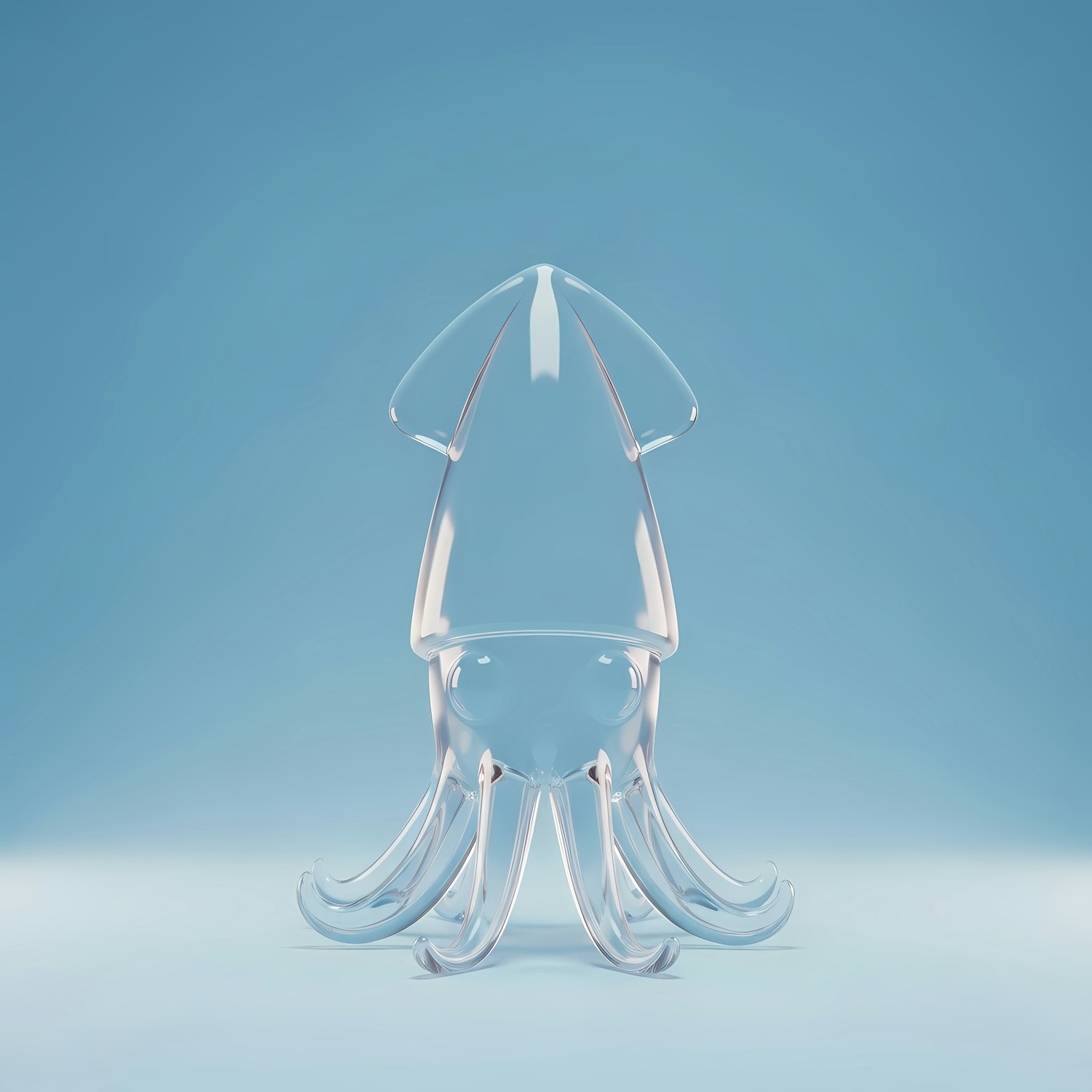 A transparent 3D squid sculpture with a glass-like finish, set against a soft blue gradient background, showcasing modern design.