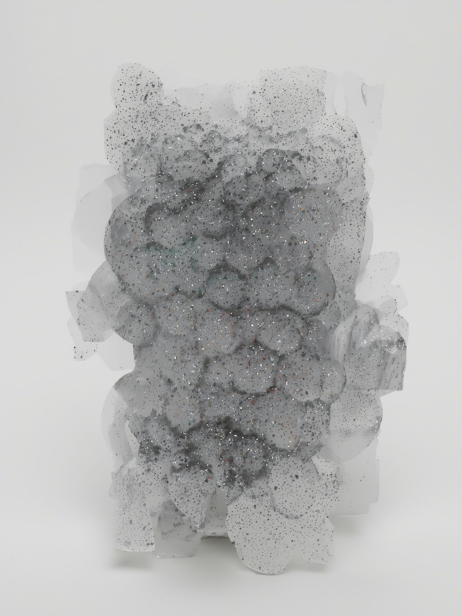 Abstract sculpture of translucent, bubble-like forms with glitter on a white background, showcasing texture and light interplay.
