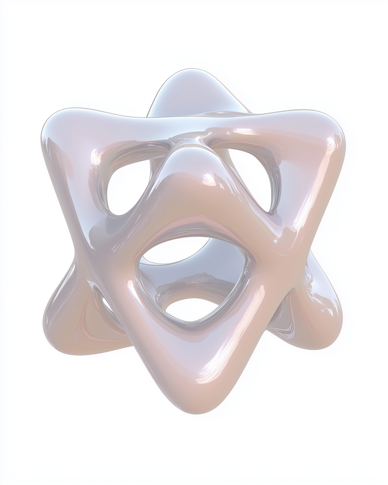 Glossy 3D abstract star-like shape with a pearlescent finish and hollow sections, set against a clean white background.
